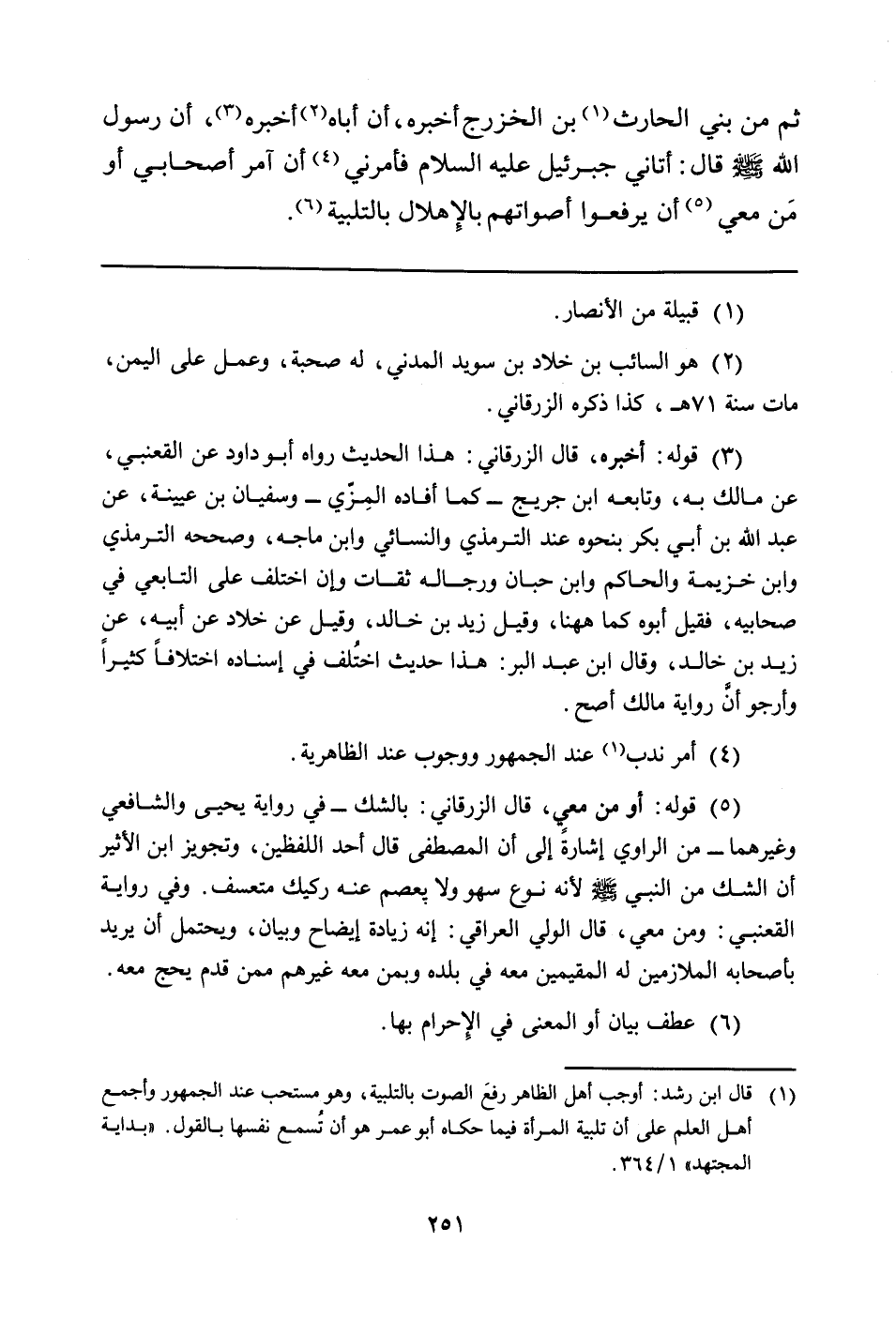 ثُمَّ مِنْ بَنِي الْحَارِثِ (¬1) بْنِ الْخَزْرَجِ أَخْبَرَهُ، أَنَّ أَبَاهُ (¬2) أَخْبَرَهُ (¬3) ، أَنّ رَسُولَ اللَّهِ صَلَّى اللَّهُ عَلَيْهِ وَسَلَّمَ قَالَ: أَتَانِي جِبْرِيلُ عَلَيْهِ السَّلامُ فَأَمَرَنِي (¬4) أَنْ آمُرَ أَصْحَابِي أَوْ مَن معي (¬5) أن يرفعوا أصواتهم بالإِهلال بالتلبية (¬6) .