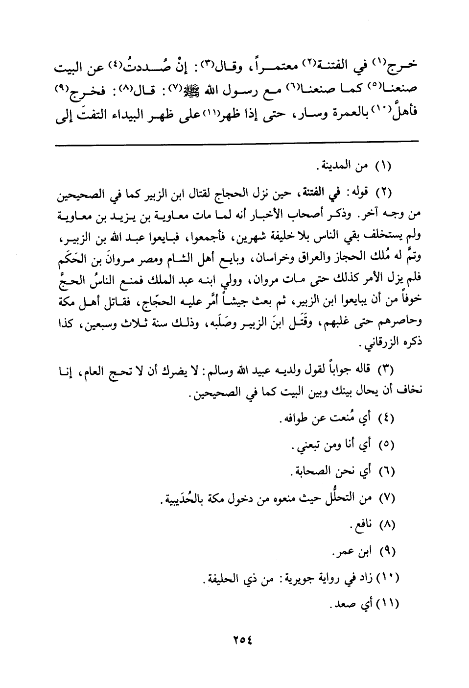خَرَجَ (¬1) فِي الْفِتْنَةِ (¬2) مُعْتَمِرًا، وَقَالَ (¬3) : إنْ صُددتُ (¬4) عَنِ الْبَيْتِ صَنَعْنَا (¬5) كَمَا صَنَعْنَا (¬6) مَعَ رَسُولِ اللَّهِ صَلَّى اللَّهُ عَلَيْهِ وَسَلَّمَ (¬7) : قَالَ (¬8) : فَخَرَجَ (¬9) فأهلَّ (¬10) بِالْعُمْرَةِ وَسَارَ، حَتَّى إِذَا ظَهَرَ (¬11) عَلَى ظهر البيداء التفتَ إلى