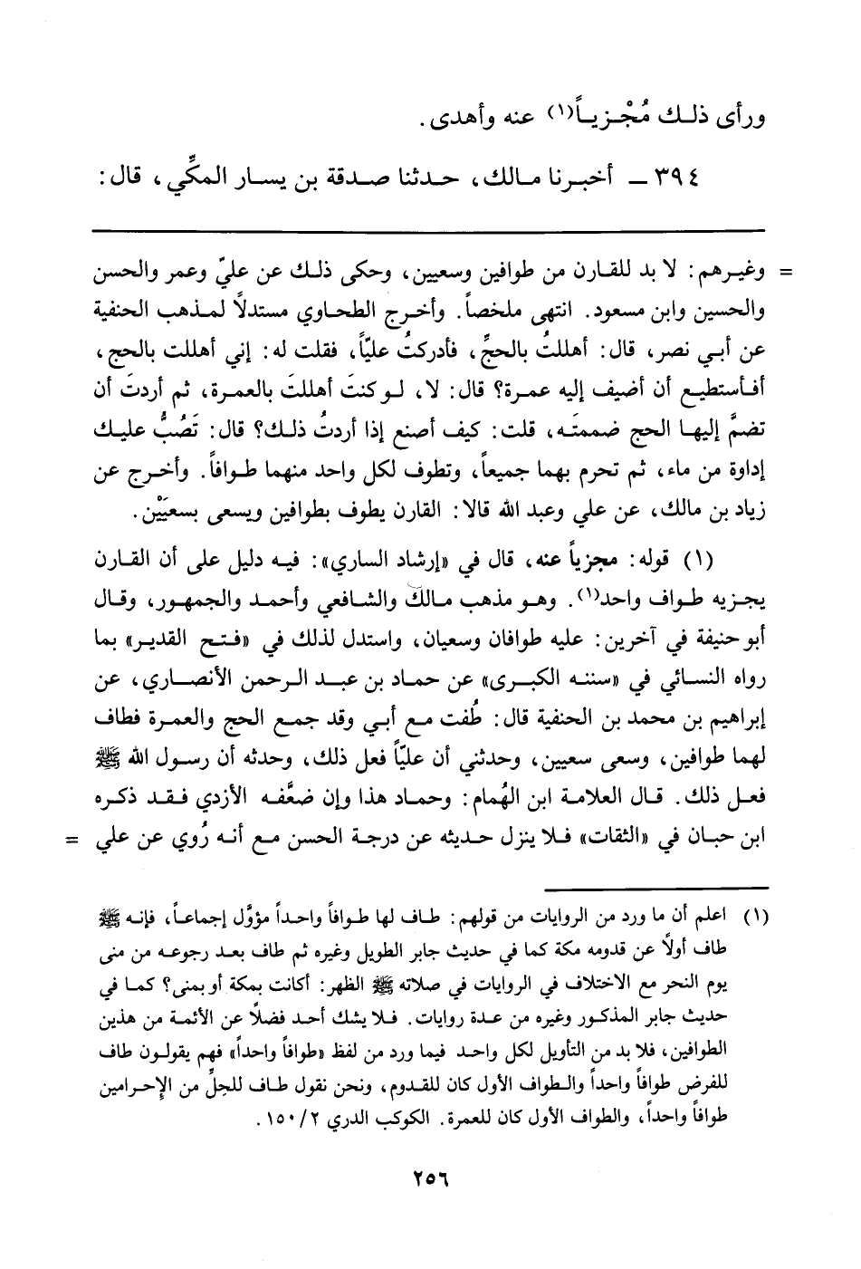 وغيرهم: لا بد للقارن من طوافين وسعيين، وحكى ذلك عن عليّ وعمر والحسن والحسين وابن مسعود: انتهى ملخصاً. وأخرج الطحاوي مستدلاً لمذهب الحنفية عن أبي نصر، قال: أهللتُ بالحجِّ، فأدركتُ عليّاً، فقلت له: إني أهللت بالحج، أفأستطيع أن أضيف إليه عمرة؟ قال: لا، لو كنتَ أهللتَ بالعمرة، ثم أردتَ أن تضمَّ إليها الحج ضممتَه، قلت: كيف أصنع إذا أردتُ ذلك؟ قال: تَصُبُّ عليك إداوة من ماء، ثم تحرم بهما جميعاً، وتطوف لكل واحد منهما طوافاً. وأخرج عن زياد بن مالك، عن علي وعبد الله قالا: القارن يطوف بطوافين ويسعى بسعيَيْن.