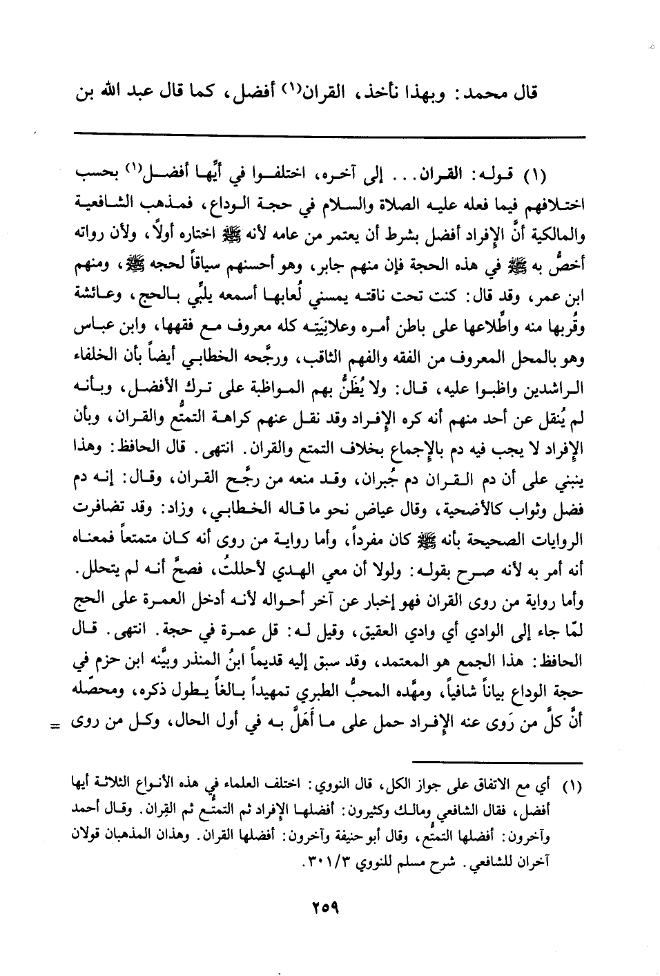 قَالَ مُحَمَّدٌ: وَبِهَذَا نَأْخُذُ، الْقِرَانُ (¬1) أَفْضَلُ، كَمَا قال عبد الله بن