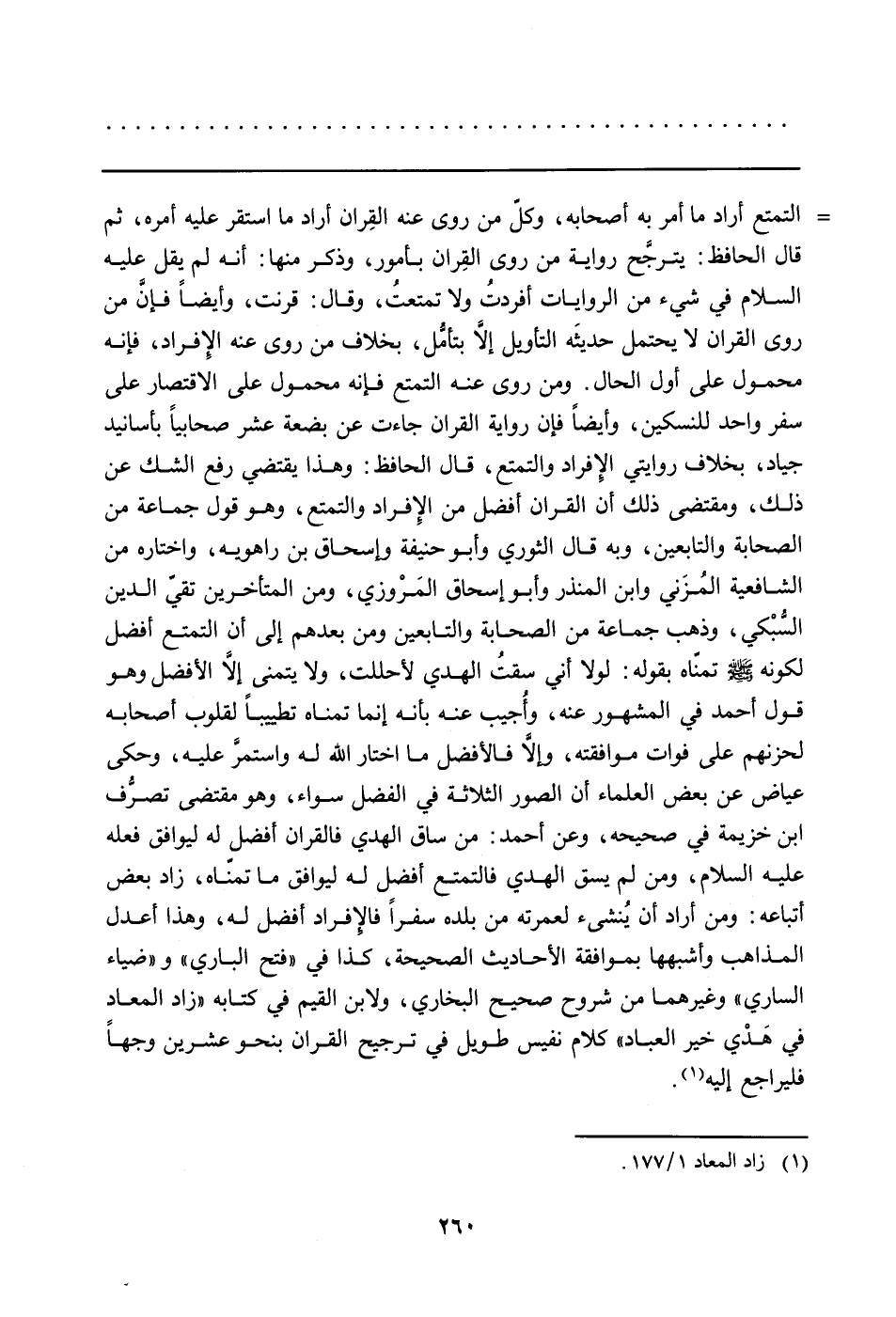 التمتع أراد ما أمر به أصحابه، وكلّ من روى عنه القِران أراد ما استقر عليه أمره، ثم قال الحافظ: يترجَّح رواية من روى القران بأمور، وذكر منها: أنه لم يقل عليه السلام في شيء من الروايات أفردتُ ولا تمتعتُ، وقال: قرنت، وأيضاً فإن من روى القران لا يحتمل حديثَه التأويل إلاَّ بتأمُّل، بخلاف من روى عنه الإفراد، فإنه محمول على أول الحال، ومن روى عنه التمتع فإنه محمول على الإقتصار على سفر واحد للنسكين، وأيضاً فإن رواية القران جاءت عن بضعة عشر صحابياً بأسانيد جياد، بخلاف روايتي الإفراد والتمتع، قال الحافظ: وهذا يقتضي رفع الشك عن ذلك، ومقتضى ذلك أن القران أفضل من الإِفراد والتمتع، وهو قول جماعة من الصحابة والتابعين، وبه قال دالثوري وأبو حنيفة وأسحاق بن راهويه، وإختاره من الشافعية المُزَني وابن المنذر وأبو إسحاق المَرْوزي، ومن المتأخرين تقيّ الدين السُبْكي، وذهب جماعة من الصحابة والتابعين ومن بعدهم إلى أن التمتع أفضل لكونه صلى الله عليه وسلَّم تمنَّاه بقوله: لولا أني سقتُ الهدي لأحللت، ولا يتمنى إلا الأفضل وهو قول أحمد في المشهور عنه، وأُجيب عنه بأنه إنما تمناه تطييباً لقلوب أصحابه لحزنهم على فوات موافقته، وإلا فالأفضل ما اختار الله له واستمرَّ عليه، وحكى عياض عن بعض العلماء أن الصور الثلاثة في الفضل سواء، وهو مقتضى تصرُّف إبن خزيمة في صحيحه، وعن أحمد: من ساق الهدي فالقران أفضل له ليوافق فعله عليه السلام، ومن لم يسق الهدي فالتمتع أفضل له ليوافق ما تمنّاه، ض أتباعه: ومن أراد أن يُنشئ لعمرته من بلده سفراً فالإفراد أفضل له، وهذا أعل المذاهب وأشبهها بموافقة الأحاديث الصحيحة، كذا في (فتح الباري) و (ضياء الساري) وغيرهما من شروح صحيح البخاري، ولابن القيم في كتابه (زاد المعاد في هدي خير العباد) كلام نفيس طويل في ترجيح القران بنحو عشرين وجهاً فليُرجع إليه