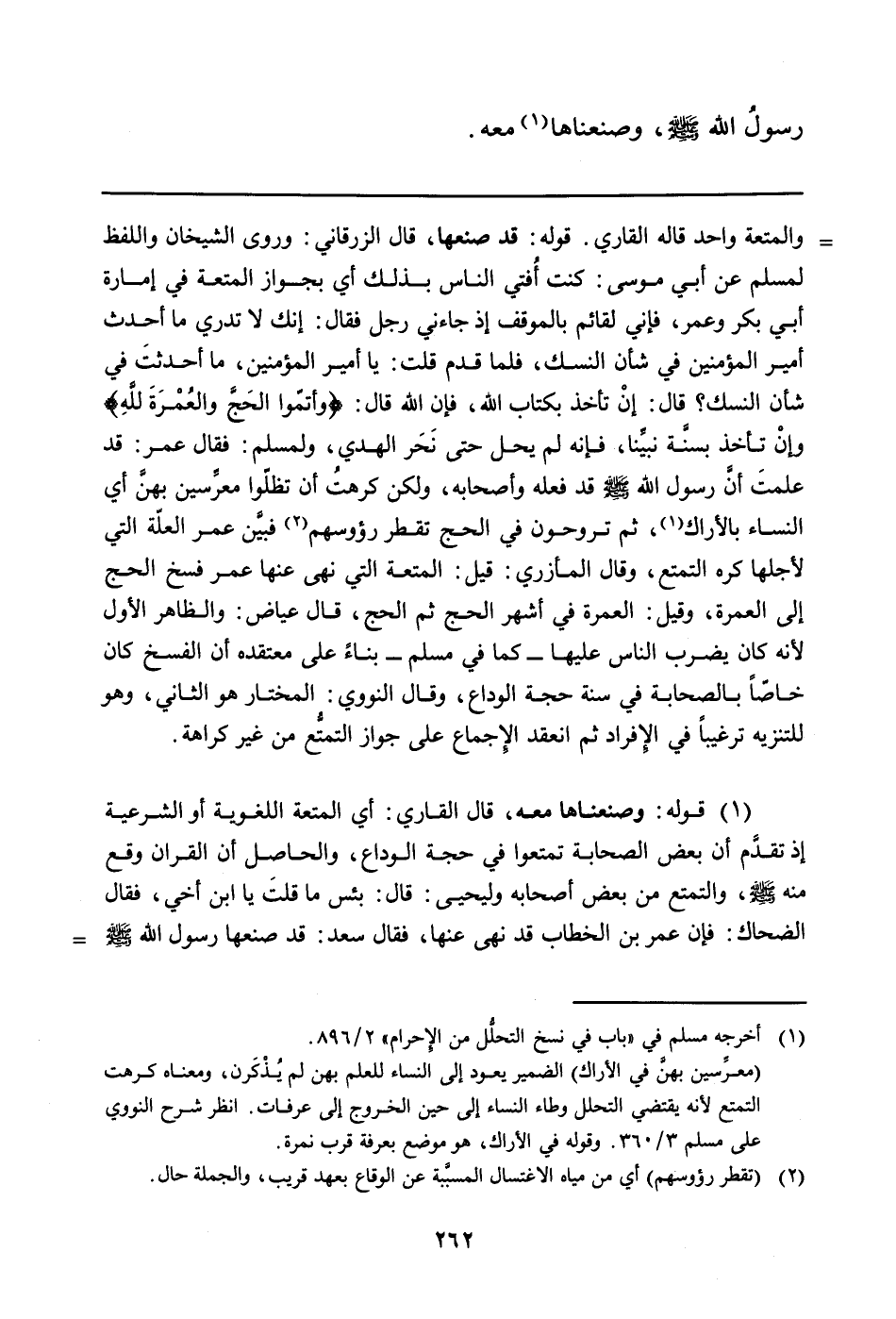 (معرِّسين بهنَّ في الأراك) الضمير يعود إلى النساء للعلم بهن لم يُذْكَرْن، ومعناه كرهت التمتع لأنه يقتضي التحلل وطاء النساء إلى حين الخروج إلى عرفات. انظر شرح النووي على مسلم 3/360. وقوله في الأراك، هو موضع بعرفة قرب نمرة) ، ثم تروحون في الحج تقطر رؤوسكم (أي من مياه الاغتسال المسبَّبة عن الوقاع بعهد قريب، والجملة حال) فبيَّن عمر العلّة التي لأجلها كره التمتع، وقال المأزري: قيل: المتعة التي نهى عنها عمر فسخ الحج إلى العمرة، وقيل: العمرة في أشهر الحج ثم الحج، قال عياض: والظاهر الأول لأنه كان يضرب الناس عليها - كما في مسلم - بناءً على معتقده أن الفسخ كان خاصّاً بالصحابة في سنة حجة الوداع، وقال النووي: المختار هو الثاني، وهو للتنزيه ترغيباً في الإِفراد ثم انعقد الإِجماع على جواز التمتُّع من غير كراهة.