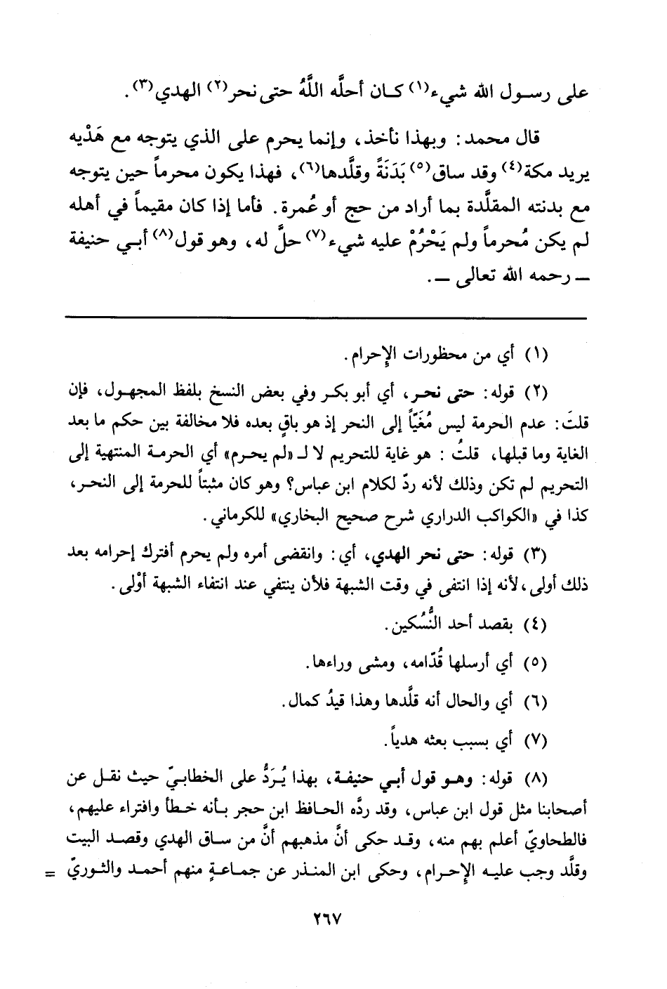 (¬8) قوله: وهو قول أبي حنيفة، بهذا يُرَدُّ على الخطابيّ حيث نقل عن أصحابنا مثل قول ابن عباس، وقد ردَّه الحافظ ابن حجر بأنه خطأ وافتراء عليهم، فالطحاويّ أعلم بهم منه، وقد حكى أنَّ مذهبهم أنَّ من ساق الهدي وقصد البيت وقلَّد وجب عليه الإِحرام، وحكى ابن المنذر عن جماعةٍ منهم أحمد والثوريّ