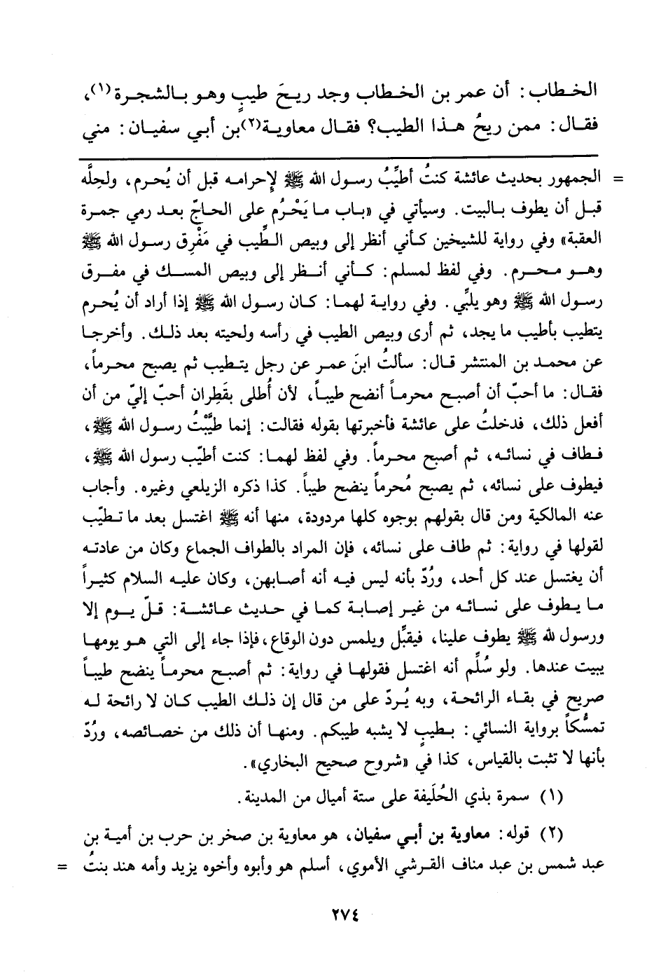 الْخَطَّابِ: أَنَّ عُمَرَ بْنَ الْخَطَّابِ وَجَدَ ريحَ طيبٍ وَهُوَ بِالشَّجَرَةِ (¬1) ، فَقَالَ: مِمَّنْ ريحُ هَذَا الطِّيبِ؟ فَقَالَ مُعَاوِيَةُ (¬2) بْنُ أَبِي سُفْيَانَ: مِنِّي