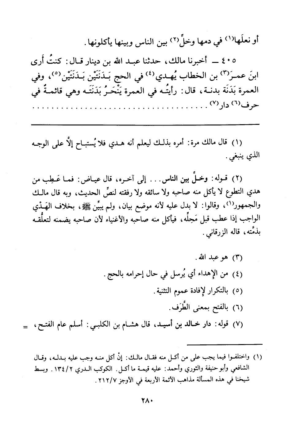 405 - أَخْبَرَنَا مَالِكٌ، حَدَّثَنَا عَبْدُ اللَّهِ بْنُ دِينَارٍ، قَالَ: كنتُ أَرى ابنَ عمرَ (¬3) بن الخطاب يُهدي (¬4) في الحج بَدَنَتَيْن بَدَنَتَيْن (¬5) ، وفي العمرة بَدَنَة بَدنة، قَالَ: رأيتُه فِي الْعُمْرَةِ يَنْحَرُ بَدَنتَه وهي قائمةٌ في حرف (¬6) دار (¬7)