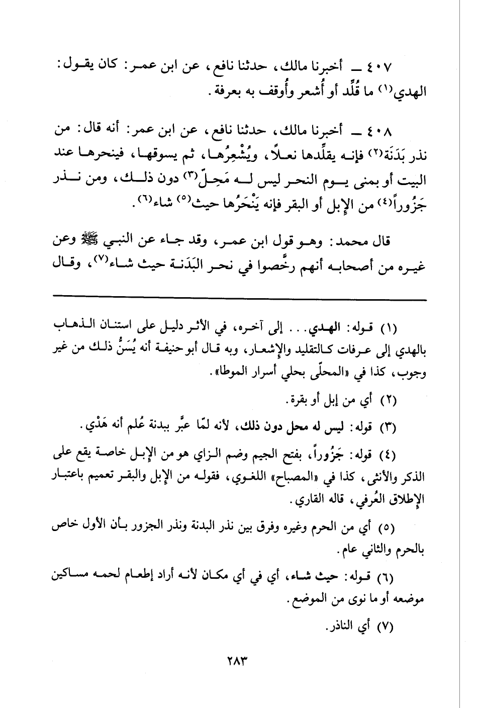 408 - أَخْبَرَنَا مَالِكٌ، حَدَّثَنَا نَافِعٌ، عَنِ ابْنِ عُمَرَ: أَنَّهُ قَالَ: مَنْ نَذَرَ بَدَنَة (¬2) فَإِنَّهُ يقلِّدها نَعْلا، ويُشعِرُها، ثُمَّ يَسُوقُهَا، فَيَنْحَرُهَا عِنْدَ الْبَيْتِ أَوْ بِمَنًى يَوْمَ النَّحْرِ لَيْسَ لَهُ مَحِلّ (¬3) دُونَ ذَلِكَ، وَمَنْ نَذَرَ جَزُوراً (¬4) مِنَ الإِبل أَوِ الْبَقَرِ فَإِنَّهُ يَنْحَرُها حَيْثُ (¬5) شَاءَ (¬6) .