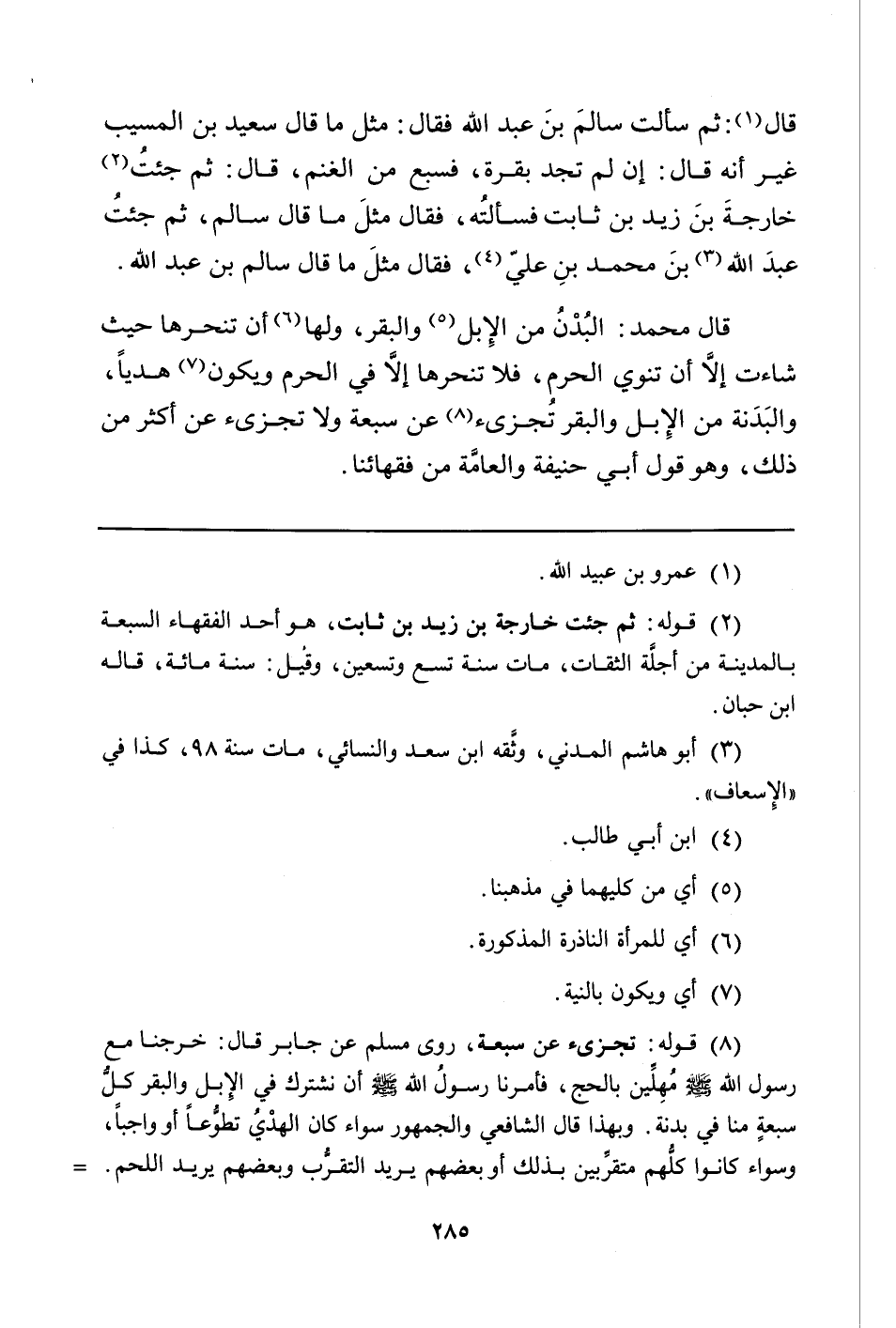 قَالَ (¬1) : ثُمَّ سَأَلْتُ سالمَ بنَ عَبْدِ اللَّهِ فَقَالَ: مِثْلَ مَا قَالَ سَعِيدُ بْنُ الْمُسَيِّبِ غَيْرَ أَنَّهُ قَالَ: إِنْ لَمْ تَجِدْ بَقَرَةً، فَسَبْعٌ مِنَ الْغَنَمِ، قَالَ: ثُمَّ جئتُ (¬2) خارجةَ بنَ زَيْدِ بْنِ ثَابِتٍ فسألتُه، فَقَالَ مثلَ مَا قَالَ سَالِمٌ، ثُمَّ جئتُ عبدَ اللَّهِ (¬3) بنَ مُحَمَّدِ بْنِ عَلِيٍّ (¬4) ، فَقَالَ مثلَ مَا قَالَ سَالِمُ بْنُ عَبْدِ اللَّهِ.