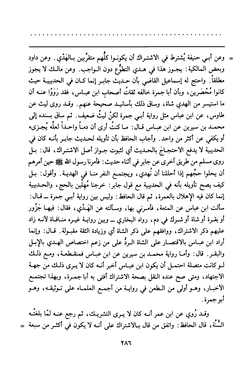 وعن أبي حنيفة يُشترط في الاشتراك أن يكونوا كلُّهم متقرِّبين بالهَدْي. وعن داود وبعض المالكية: يجوز هذا في هدي التطوُّع دون الواجب. وعن مالك لا يجوز مطلقاً. واحتج له إسماعيل القاضي بأن حديث جابر إنما كان في الحديبية حيث كانوا مُحْصَرين، وبأن أبا جمرة خالفه ثقاتُ أصحاب ابن عباس، فقد رَوَوْا عنه أن ما استيسر من الهدي شاة، وساق ذلك بأسانيد صحيحة عنهم. وقد روى ليث عن طاوس، عن ابن عباس مثل رواية أبي جمرة لكنْ ليثٌ ضعيف. ثم ساق بسنده إلى محمد بن سيرين عن ابن عباس قال: ما كنتُ أرى أن دماً واحداً لعلّه يُجزئ أو يكفي عن أكثر من واحد. وأجاب الحافظ بأن تأويله لحديث جابر بأنه كان في الحديبية لا يدفع الاحتجاجَ بالحديث أي لثبوت جواز أصل الاشتراك، قال: بل روى مسلم من طريق أخرى عن جابر في أثناء حديث: فأمرنا رسول الله صلّى الله عليه وسلّم حين أمرهم أن يحلوا حجَّهم إذا أحللنا أن نُهدي، ويجتمع النفر منا في الهدية. وأقول: بل كيف يصح تأويله بأنه في الحديبية مع قول جابر: خرجنا مُهِلِّين بالحج، والحديبية إنما كان فيه الإِهلال بالعمرة، ثم قال الحافظ: وليس بين رواية أبي جمرة - قال: سألت ابن عباس عن المتعة، فأمرني بها، وسألته عن الهَدْي، فقال: فيها جَزُور أو بقرة أو شاة أو شرك في دم، رواه البخاري - وبين رواية غيره منافاة لأنه زاد عليهم ذكر الاشتراك، ووافقهم على ذكر الشاة أي وزيادة الثقة مقبولة. قال: وإنما أراد ابن عباس بالاقتصار على الشاة الردُّ على من زعم اختصاص الهدي بالإِبل والبقر. قال: وأما رواية محمد بن سيرين عن ابن عباس فمنقطعة، ومع ذلك لو كانت متصلة احتمل أن يكون ابن عباس أخبر أنه كان لا يرى ذلك من جهة الاجتهاد، ومتى صح عنده النقل بصحة الاشتراك أفتى به أبا جمرة، وبهذا تجتمع الأخبار، وهو أولى من الطعن في رواية من أجمع العلماء على توثيقه، وهو أبو جمرة.