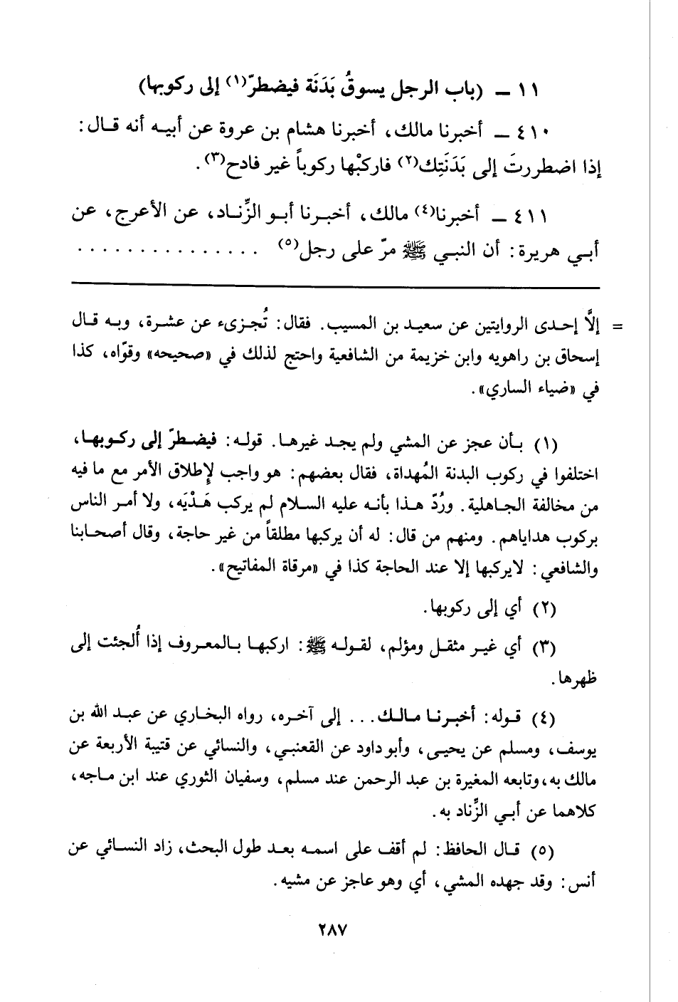 410 - أَخْبَرَنَا مَالِكٌ، أَخْبَرَنَا هِشَامُ بْنُ عُرْوَةَ عَنْ أَبِيهِ أَنَّهُ قَالَ: إِذَا اضطررتَ إِلَى بَدَنَتِك (¬2) فارْكبْها رُكُوبًا غَيْرَ فَادِحٍ (¬3) .