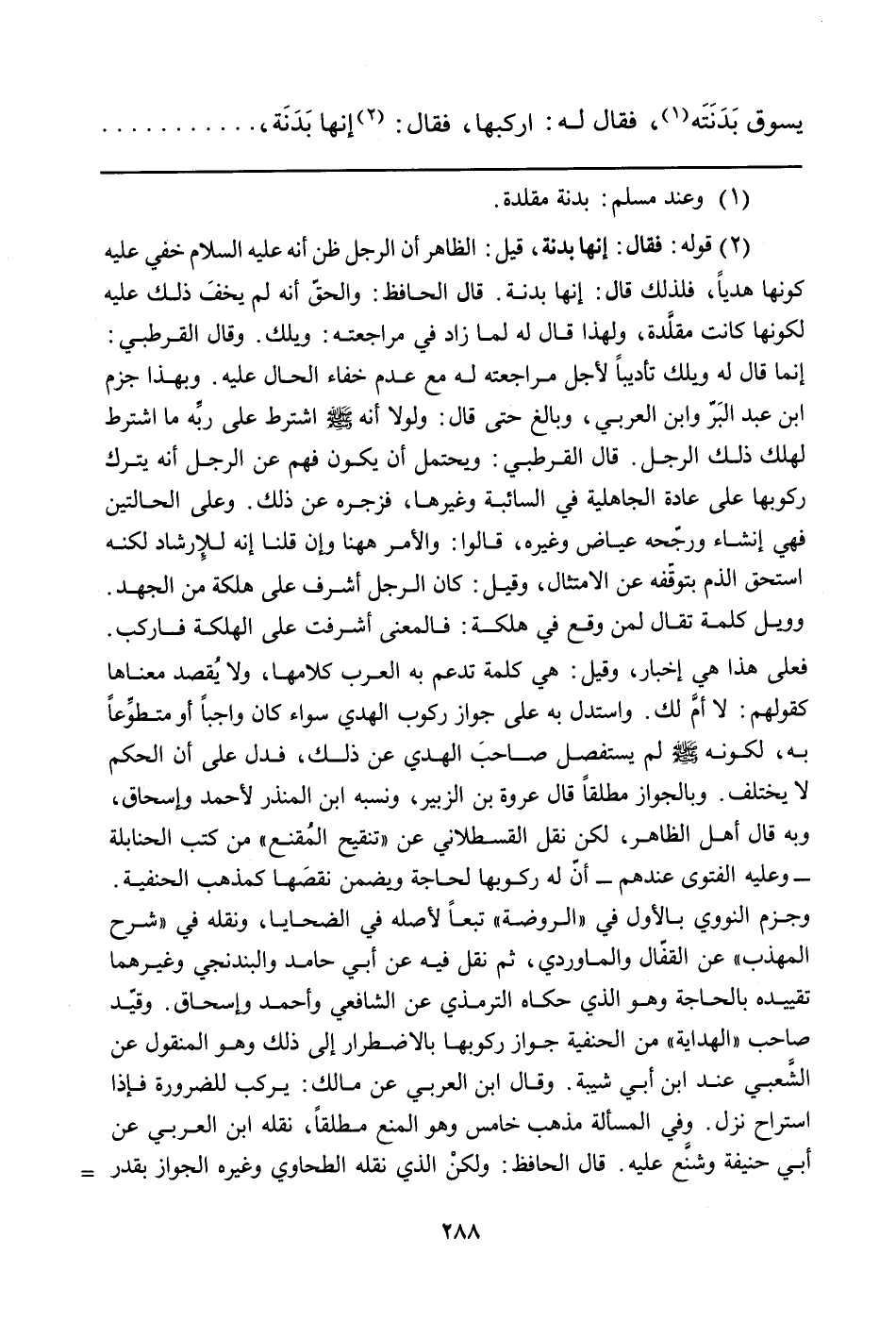 (¬2) قوله: فَقَالَ: أَنَّهَا بَدَنَةٌ، قيل: الظاهر أن الرجل ظن أنه عليه السلام خفي عليه كونها هدياً، فلذلك قال: إنها بدنة. قال الحافظ: والحقّ أنه لم يخفَ ذلك عليه لكونها كانت مقلَّدة، ولهذا قال له لما زاد في مراجعته: ويلك. وقال القرطبي: إنما قال له ويلك تأديباً لأجل مراجعته له مع عدم خفاء الحال عليه. وبهذا جزم ابن عبد البَرّ وابن العربي، وبالغ حتى قال: ولولا أنه صلّى الله عليه وسلّم اشترط على ربِّه ما اشترط لهلك ذلك الرجل. قال القرطبي: ويحتمل أن يكون فهم عن الرجل أنه يترك ركوبها على عادة الجاهلية في السائبة وغيرها، فزجره عن ذلك. وعلى الحالتين فهي إنشاء ورجّحه عياض وغيره، قالوا: والأمر ههنا وإن قلنا إنه للإِرشاد لكنه استحق الذم بتوقّفه عن الامتثال، وقيل: كان الرجل أشرف على هلكة من الجهد. وويل كلمة تقال لمن وقع في هلكة: فالمعنى أشرفت على الهلكة فاركب. فعلى هذا هي إخبار، وقيل: هي كلمة تدعم به العرب كلامها، ولا يُقصد معناها كقولهم: لا أمَّ لك. واستدل به على جواز ركوب الهدي سواء كان واجباً أو متطوِّعاً به، لكونه صلّى الله عليه وسلّم لم يستفصل صاحبَ الهدي عن ذلك، فدل على أن الحكم لا يختلف. وبالجواز مطلقاً قال عروة بن الزبير، ونسبه ابن المنذر لأحمد وإسحاق، وبه قال أهل الظاهر، لكن نقل القسطلاني عن "تنقيح المُقنع" من كتب الحنابلة - وعليه الفتوى عندهم - أنّ له ركوبها لحاجة ويضمن نقصَها كمذهب الحنفية. وجزم النووي بالأول في "الروضة" تبعاً لأصله في الضحايا، ونقله في "شرح المهذب" عن القفّال والماوردي، ثم نقل فيه عن أبي حامد والبندنجي وغيرهما تقييده بالحاجة وهو الذي حكاه الترمذي عن الشافعي وأحمد وإسحاق. وقيّد صاحب "الهداية" من الحنفية جواز ركوبها بالاضطرار إلى ذلك وهو المنقول عن الشَّعبي عند ابن أبي شيبة. وقال ابن العربي عن مالك: يركب للضرورة فإذا استراح نزل. وفي المسألة مذهب خامس وهو المنع مطلقاً، نقله ابن العربي عن أبي حنيفة وشنّع عليه. قال الحافظ: ولكنْ الذي نقله الطحاوي وغيره الجواز بقدر