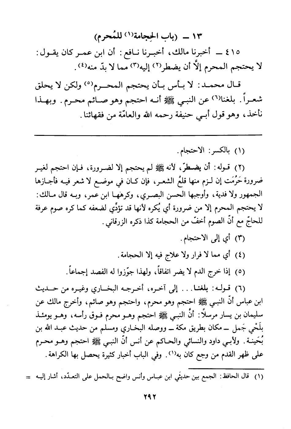 415 - أَخْبَرَنَا مَالِكٌ، أَخْبَرَنَا نَافِعٌ: أَنَّ ابْنَ عُمَرَ كَانَ يَقُولُ: لا يَحْتَجِمُ الْمُحْرِمُ إلاَّ أَنْ يَضْطَرَّ (¬2) إِلَيْهِ (¬3) مِمَّا لا بُدَّ مِنْهُ (¬4) .
