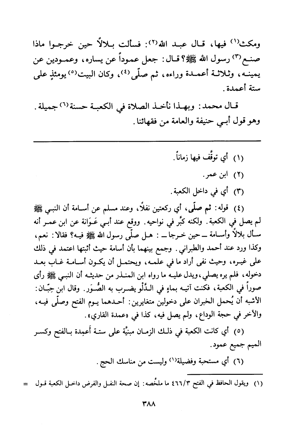 (¬6) أي مستحبة وفضيلة (ويقول الحافظ في الفتح 3/466 ما ملخِّصه: إن صحة النفل والفرض داخل الكعبة قول الجمهور، وإليه ذهب أبو حنيفة والشافعي، وعن ابن عباس عدم الصحة مطلقاً للزوم استدبار بعض الكعبة وقد ورد الأمر باستقبال جميعها، وبه قال بعض المالكية والظاهرية والطبري، ومشهور قول مالك على رأي المازري منع الفرض ووجوب الإعادة، وأطلق الترمذي عنه جواز النفل، فكأنه اختلف النقل عنه. اهـ -) وليست من مناسك الحج.