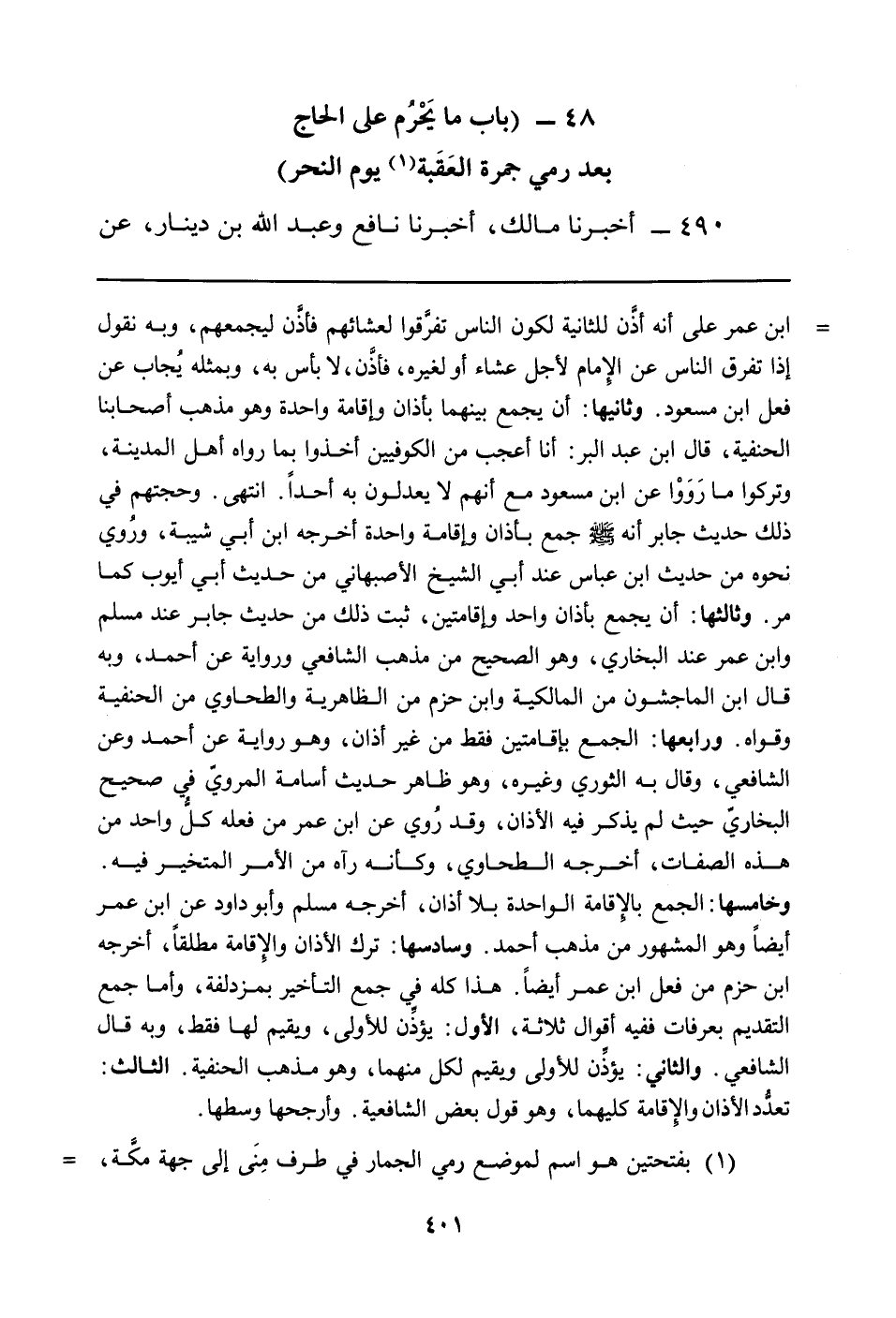 وخامسها: الجمع بالإِقامة الواحدة بلا أذان، أخرجه مسلم وأبو داود عن ابن عمر أيضاً وهو المشهور من مذهب أحمد. وسادسها: ترك الأذان والإِقامة مطلقاً، أخرجه ابن حزم من فعل ابن عمر أيضاً. هذا كله في جمع التأخير بمزدلفة، وأما جمع التقديم بعرفات ففيه أقوال ثلاثة، الأول: يؤذَّن للأولى، ويقيم لها فقط، وبه قال الشافعي. والثاني: يؤذَّن للأولى ويقيم لكل منهما، وهو مذهب الحنفية. الثالث: تعدُّد الأذان والإقامة كليمها، وهو قول بعض الشافعية. وأرجحها وسطها.
