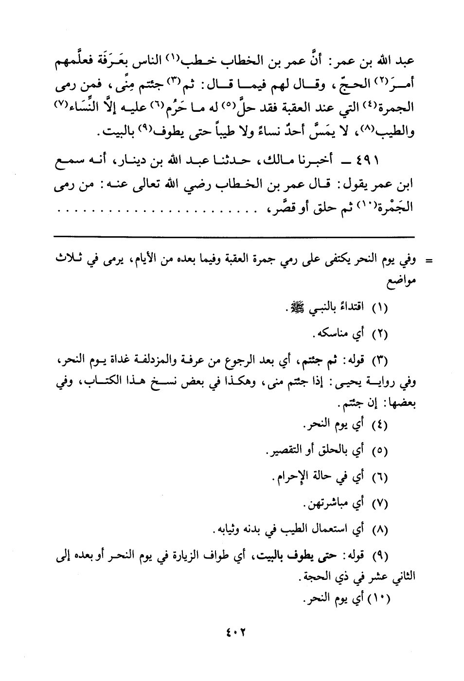 491 - أَخْبَرَنَا مَالِكٌ، حَدَّثَنَا عَبْدُ اللَّهِ بْنُ دِينَارٍ، أَنَّهُ سَمِعَ ابْنَ عُمَرَ يَقُولُ: قَالَ عُمَرُ بْنُ الْخَطَّابِ رَضِيَ اللَّهُ عَنْهُ: مَنْ رَمَى الجَمْرة (¬10) ثُمَّ حَلَقَ أَوْ قصَّر،