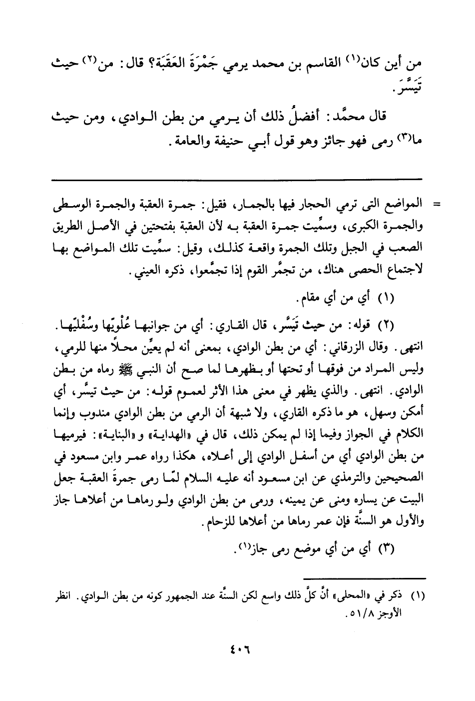 انتهى. وقال الزرقاني: أي من بطن الوادي، بمعنى أنه لم يعَّين محلاً منها للرمي، وليس المراد من فوقها أو تحتها أو بظهرها لما صح أن النبي صلى الله عليه وسلم رماه من بطن الوادي. انتهى. والذي يظهر في معنى هذا الأثر لعموم قوله: من حيث تيسَّر، أي أمكن وسهل، هو ما ذكره القاري، ولا شبهة أن الرمي من بطن الوادي مندوب وإنما الكلام في الجواز وفيما إذا لم يمكن ذلك، قال في " الهداية"و" البناية": فيرميها من بطن الوادي أي من أسفل الوادي إلى أعلاه، هكذا رواه عمر وابن مسعود في الصحيحين والترمذي عن ابن مسعود أنه عليه السلام لمّا رمى جمرةَ العقبة جعل البيت عن يساره ومنى عن يمينة، ورمى من بطن الوادي. ولو رماها من أعلاها جاز، والأول هو السنَّة فإن عمر رماها من أعلاها للزحام.