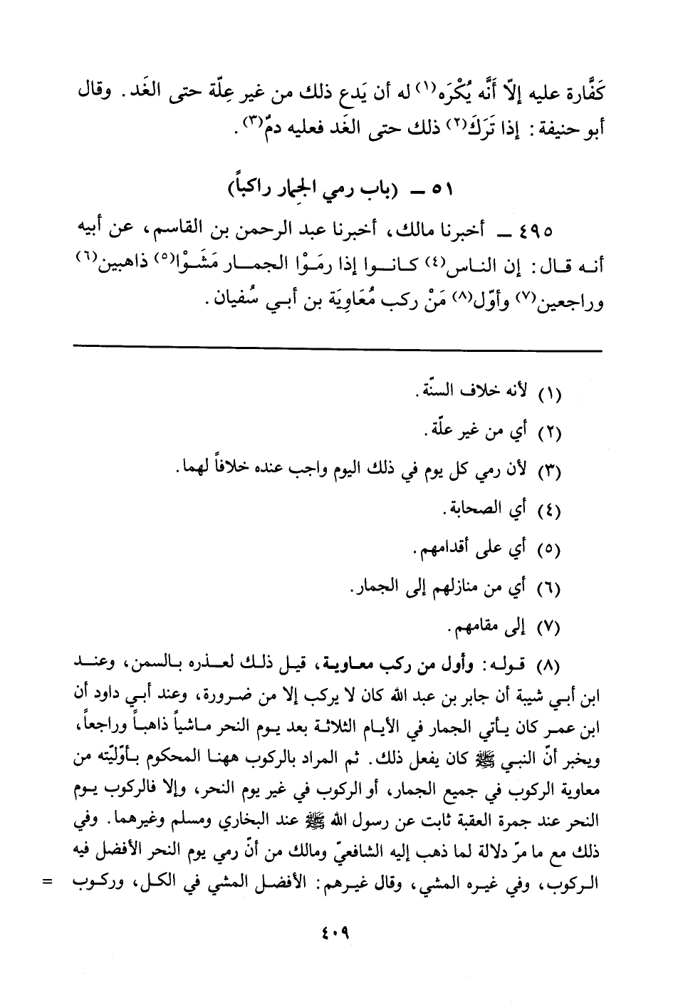 495 - أَخْبَرَنَا مَالِكٌ، أَخْبَرَنَا عَبْدُ الرَّحْمَنِ بْنُ الْقَاسِمِ، عَنْ أَبِيهِ أَنَّهُ قَالَ: أَنَّ النَّاسَ (¬4) كَانُوا إِذَا رمَوْا الْجِمَارَ مَشَوْا (¬5) ذَاهِبِينَ (¬6) وَرَاجِعِينَ (¬7) وَأَوَّلُ (¬8) من ركب مُعَاوِيَة بن أبي سُفيان.
