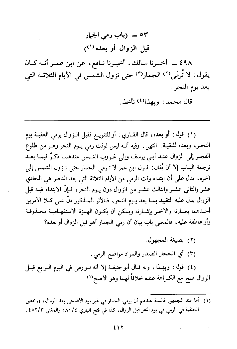 498 - أَخْبَرَنَا مَالِكٌ، أَخْبَرَنَا نَافِعٌ، عَنِ ابْنِ عُمَرَ أَنَّهُ كَانَ يَقُولُ: لا تُرمَى (¬2) الْجِمَارُ (¬3) حَتَّى تَزُولَ الشَّمْسُ فِي الأَيَّامِ الثَّلاثَةِ الَّتِي بَعْدَ يوم النحر.