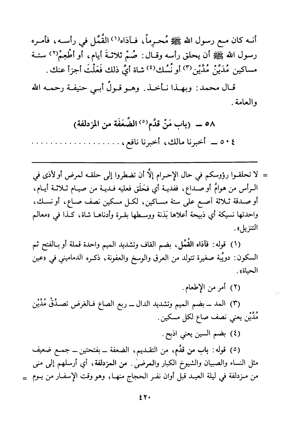لا تحلقوا رؤوسكم في حال الإِحرام إلاَّ أن تضطروا إلى حلقه لمرض أو لأذى في الرأس من هوامَّ أو صداع، ففدية أي فحَلَق فعليه فدية من صيام ثلاثة أيام، أو صدقة ثلاثة آصع على ستة مساكين، لكل مسكين نصف صاع، أو نسك، واحدتها نسيكة أي ذبيحة أعلاها بَدَنة ووسطها بقرة وأدناها شاة، كذا في "معالم التنزيل".