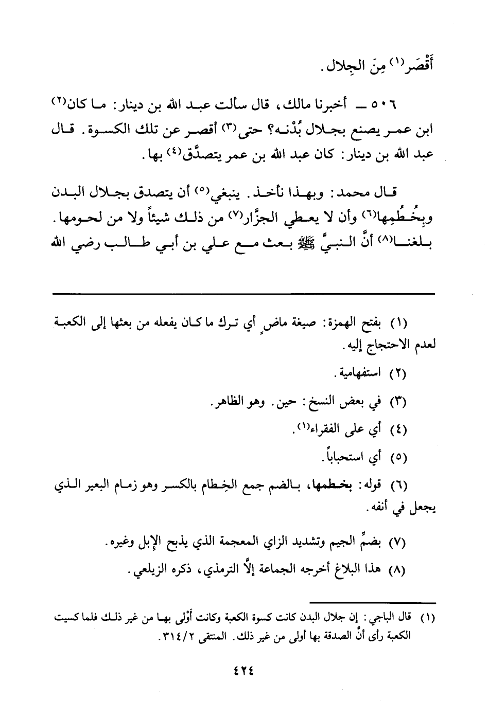 506 - أَخْبَرَنَا مَالِكٌ، قَالَ سَأَلْتُ عَبْدَ اللَّهِ بْنَ دِينَارٍ: مَا كَانَ (¬2) ابْنُ عُمَرَ يَصْنَعُ بِجِلالِ بُدْنه؟ حَتَّى (¬3) أَقْصَرَ عَنْ تِلْكَ الْكِسْوَةِ. قَالَ عَبْدُ اللَّهِ بْنُ دِينَارٍ: كَانَ عَبْدُ اللَّهِ بْنُ عُمَرَ يتصدَّق (¬4) بِهَا.