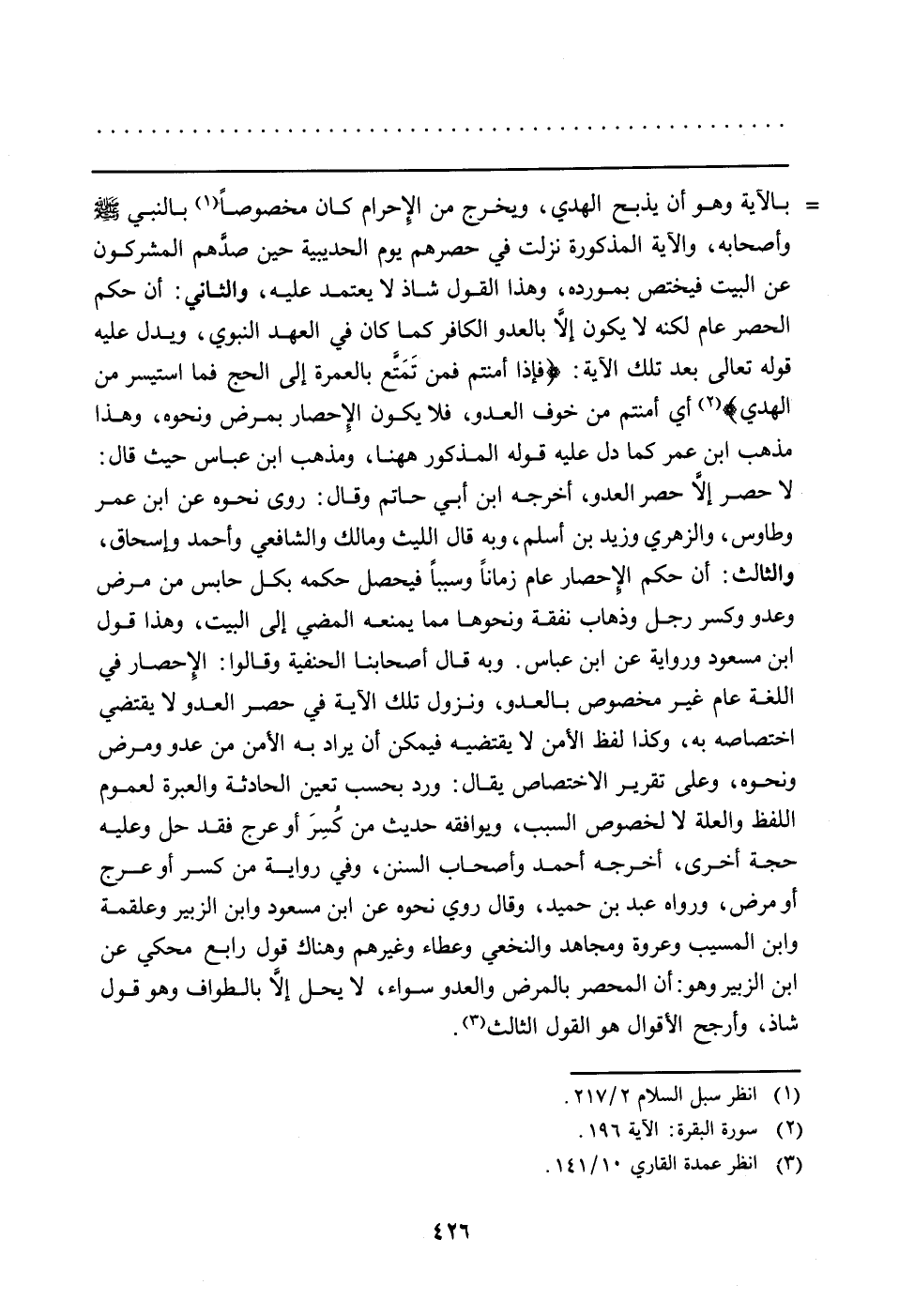 بالآية وهو أن يذبح الهدي، ويخرج من الإِحرام كان مخصوصاً (انظر سبل السلام 2/217) بالنبي صلى الله عليه وسلم وأصحابه، والآية المذكورة نزلت في حصرهم يوم الحديبية حين صدَّهم المشركون عن البيت فيختص بمورده، وهذا القول شاذ لا يعتمد عليه، والثاني: أن حكم الحصر عام لكنه لا يكون إلاَّ بالعدو الكافر كما كان في العهد النبوي، ويدل عليه قوله تعالى بعد تلك الآية: {فإذا أمنتم فمن تَمَتَّع بالعمرة إلى الحج فما استيسر من الهدي} (سورة البقرة: الآية 196) أي أمنتم من خوف العدو، فلا يكون الإِحصار بمرض ونحوه، وهذا مذهب ابن عمر كما دل عليه قوله المذكور ههنا، ومذهب ابن عباس حيث قال: لا حصر إلاَّ حصر العدو، أخرجه ابن أبي حاتم وقال: روى نحوه عن ابن عمر وطاوس، والزهري وزيد بن أسلم، وبه قال الليث ومالك والشافعي وأحمد وإسحاق، والثالث: أن حكم الإِحصار عام زماناً وسبباً فيحصل حكمه بكل حابس من مرض وعدو وكسر رجل وذهاب نفقة ونحوها مما يمنعه المضي إلى البيت، وهذا قول ابن مسعود ورواية عن ابن عباس. وبه قال أصحابنا الحنفية وقالوا: الإِحصار في اللغة عام غير مخصوص بالعدو، ونزول تلك الآية في حصر العدو لا يقتضي اختصاصه به، وكذا لفظ الأمن لا يقتضيه فيمكن أن يراد به الأمن من عدو ومرض ونحوه، وعلى تقرير الاختصاص يقال: ورد بحسب تعين الحادثة والعبرة لعموم اللفظ والعلة لا لخصوص السبب، ويوافقه حديث من كُسِرَ أو عرج فقد حل وعليه حجة أخرى، أخرجه أحمد وأصحاب السنن، وفي رواية من كسر أوعرج أو مرض، ورواه عبد بن حميد، وقال روي نحوه عن ابن مسعود وابن الزبير وعلقمة وابن المسيب وعروة ومجاهد والنخعي وعطاء وغيرهم وهناك قول رابع محكي عن ابن الزبير وهو: أن المحصر بالمرض والعدو سواء، لا يحل إلاَّ بالطواف وهو قول شاذ، وأرجح الأقوال هو القول الثالث
