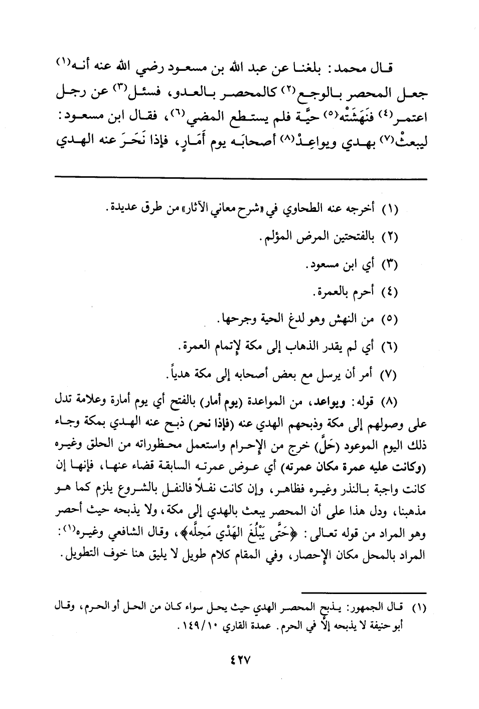 قَالَ مُحَمَّدٌ: بَلَغَنَا عَنْ عَبْدِ اللَّهِ بْنِ مَسْعُودٍ رَضِيَ اللَّهُ عَنْهُ أَنَّهُ (¬1) جَعَلَ الْمُحْصَرَ بِالْوَجَعِ (¬2) كَالْمُحْصَرِ بِالْعَدُوِّ، فَسُئِلَ (¬3) عَنْ رَجُلٍ اعْتَمَرَ (¬4) فنَهَشَته (¬5) حيَّة فَلَمْ يَسْتَطِعِ الْمُضِيَّ (¬6) ، فَقَالَ ابْنُ مَسْعُودٍ: لِيَبْعَثْ (¬7) بِهَدْيٍ ويواعِد (¬8) أصحابَه يَوْمَ أَمَارٍ، فإذا نَحَرَ عنه الهدي