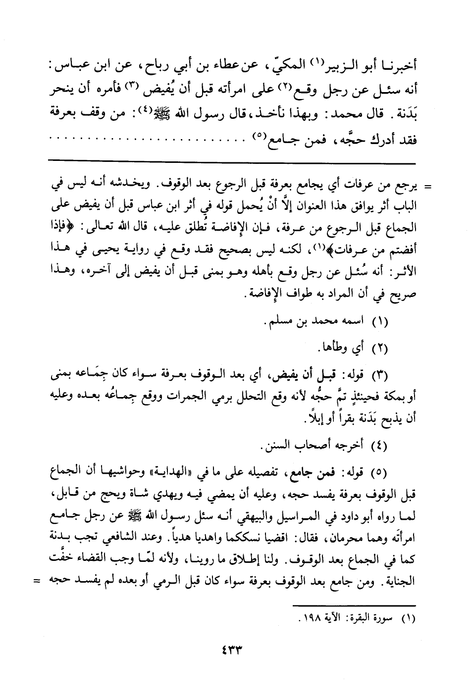 أَخْبَرَنَا أَبُو الزُّبَيْرِ (¬1) الْمَكِّيُّ، عَنْ عَطَاءِ بْنِ أَبِي رَبَاحٍ، عَنِ ابْنِ عَبَّاسٍ: أَنَّهُ سُئِلَ عَنْ رَجُلٍ وَقَعَ (¬2) عَلَى امْرَأَتِهِ قَبْلَ أَنْ يُفيض (¬3) فَأَمَرَهُ أَنْ يَنْحَرَ بَدَنة. قَالَ مُحَمَّدٌ: وَبِهَذَا نَأْخُذُ، قَالَ رَسُولُ اللَّهِ صَلَّى اللَّهُ عَلَيْهِ وَسَلَّمَ (¬4) : مَنْ وَقَفَ بِعَرَفَةَ فَقَدْ أَدْرَكَ حجَّه، فمن جامع (¬5)