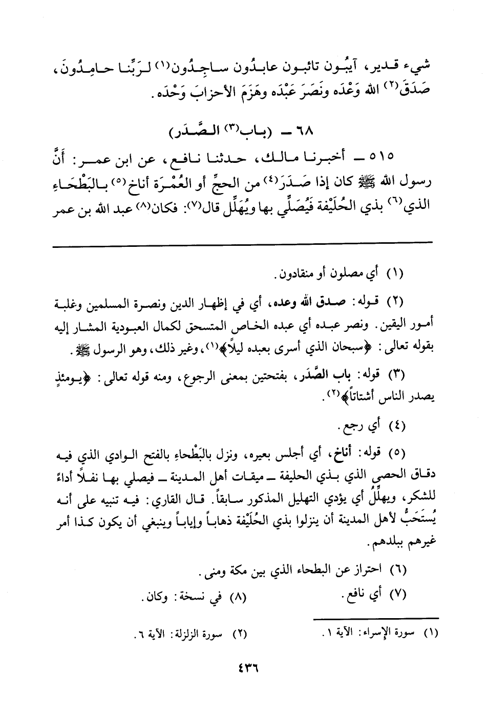 515 - أَخْبَرَنَا مَالِكٌ، حَدَّثَنَا نافع، عن ابن عمر: أَنَّ رسول الله صَلَّى اللَّهُ عَلَيْهِ وَسَلَّمَ كَانَ إِذَا صَدَرَ (¬4) مِنَ الحجِّ أَوِ العُمرَة أَنَاخَ (¬5) بالبَطحَاءِ الَّذِي (¬6) بِذِي الحُلَيفة فَيُصَلِّي بِهَا ويُهَلِّل قَالَ (¬7) : فَكَانَ (¬8) عبد الله بن