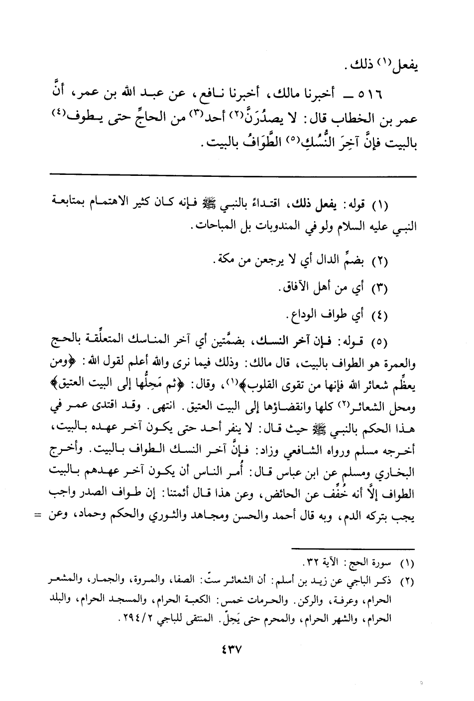 516 - أَخْبَرَنَا مَالِكٌ، أَخْبَرَنَا نَافِعٌ، عَنْ عَبْدِ اللَّهِ بْنِ عُمَرَ، أنَّ عُمَرَ بْنَ الْخَطَّابِ قَالَ: لا يصدُرَنَّ (¬2) أَحَدٌ (¬3) مِنَ الحاجِّ حَتَّى يَطُوفَ (¬4) بِالْبَيْتِ فإنَّ آخِرَ النُّسُكِ (¬5) الطَّوَافُ بالبيت.