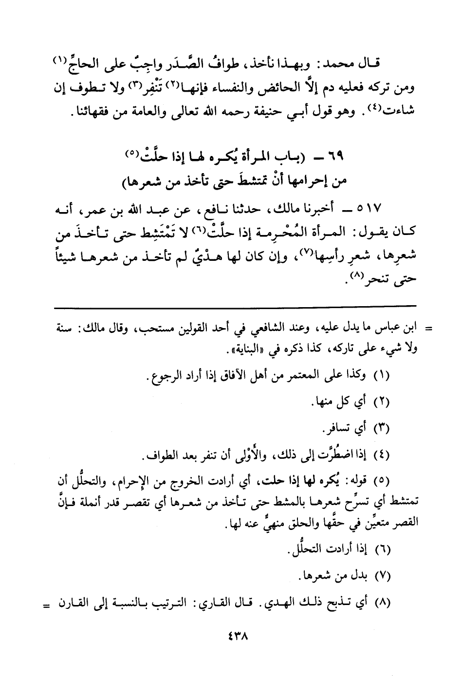 517 - أَخْبَرَنَا مَالِكٌ، حَدَّثَنَا نَافِعٌ، عَنْ عَبْدِ اللَّهِ بْنِ عُمَرَ، أَنَّهُ كَانَ يَقُولُ: الْمَرْأَةُ المُحرِمة إِذَا حلَّت (¬6) لا تَمتَشِط حَتَّى تأخذَ مِنْ شعرِها، شعرِ رأسِها (¬7) ، وَإِنْ كَانَ لَهَا هديٌ لَمْ تَأْخُذْ مِنْ شعرها شيئاً حتى تنحر (¬8) .