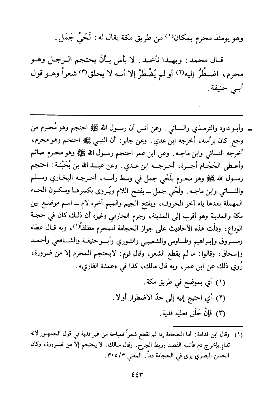 وأبو داود والترمذي والنسائي. وعن أنس أن رسول الله صلى الله عليه وسلم احتجم وهو مُحرم من وجعٍ كان برأسه، أخرجه ابن عدي. وعن جابر: أن النبي صلى الله عليه وسلم احتجم وهو محرم، أخرجه النسائي وابن ماجه. وعن ابن عمر احتجم رسول الله صلى الله عليه وسلم وهو محرم صائم وأعطى الحَجَّام أجرة، أخرجه ابن عدي. وعن عبد الله بن بُحَينة: احتجم رسول الله صلى الله عليه وسلم وهو محرم بلَحي جمل في وسط رأسه، أخرجه البخاري ومسلم والنسائي وابن ماجه. ولَحي جمل - بفتح اللام ويُروى بكسرها وسكون الحاء المهملة بعدها ياء آخر الحروف، وبفتح الجيم والميم آخره لام - اسم موضع بين مكة والمدينة وهو أقرب إلى المدينة، وجزم الحازمي وغيره أن ذلك كان في حجة الوداع، ودلّت هذه الأحاديث على جواز الحجامة للمحرم مطلقاً (وقال ابن قدامة: أما الحجامة إذا لم تقطع شعراً فمباحة من غير فدية في قول الجمهور لأنه تداوٍ بإخراج دم فأشبه الفصد وربط الجرح، وقال مالك: لا يحتجم إلا من ضرورة، وكان الحسن البصري يرى في الحجامة دماً. المغني 3/305) ، وبه قال عطاء ومسروق وإبراهيم وطاوس والشعبي والثوري وأبو حنيفة والشافعي وأحمد وإسحاق، وقالوا: ما لم يقطع الشعر، وقال قوم: لا يحتجم المحرم إلا من ضرورة، رُوي ذلك عن ابن عمر، وبه قال مالك، كذا في "عمدة القاري".