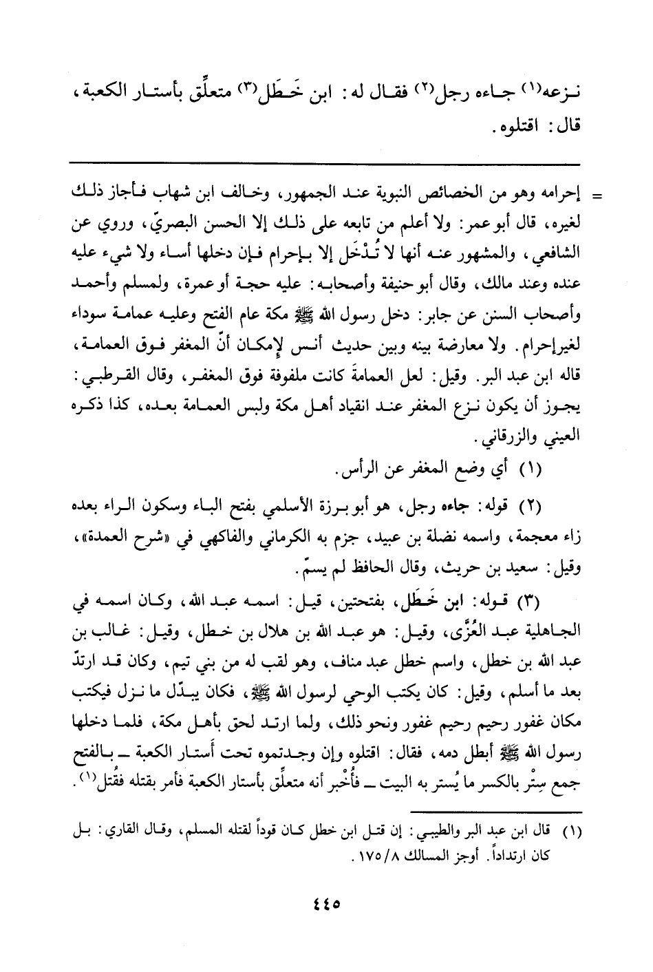 (¬3) قوله: ابن خَطَل، بفتحتين، قيل: اسمه عبد الله، وكان اسمه في الجاهلية عبد العُزَّى، وقيل: هوعبد الله بن هلال بن خطل، وقيل: غالب بن عبد الله بن خطل، واسم خطل عبد مناف، وهو لقب له من بني تيم، وكان قد ارتدّ بعد ما أسلم، وقيل: كان يكتب الوحي لرسول الله صلى الله عليه وسلم، فكان يبدّل ما نزل فيكتب مكان غفور رحيم رحيم غفور ونحو ذلك، ولما ارتد لحق بأهل مكة، فلما دخلها رسول الله صلى الله عليه وسلم أبطل دمه، فقال: اقتلوه وإن وجدتموه تحت أَستار الكعبة - بالفتح جمع سِتر بالكسر ما يُستربه البيت - فأُخبر أنه متعلِّق بأستار الكعبة فأمربقتله فقُتل