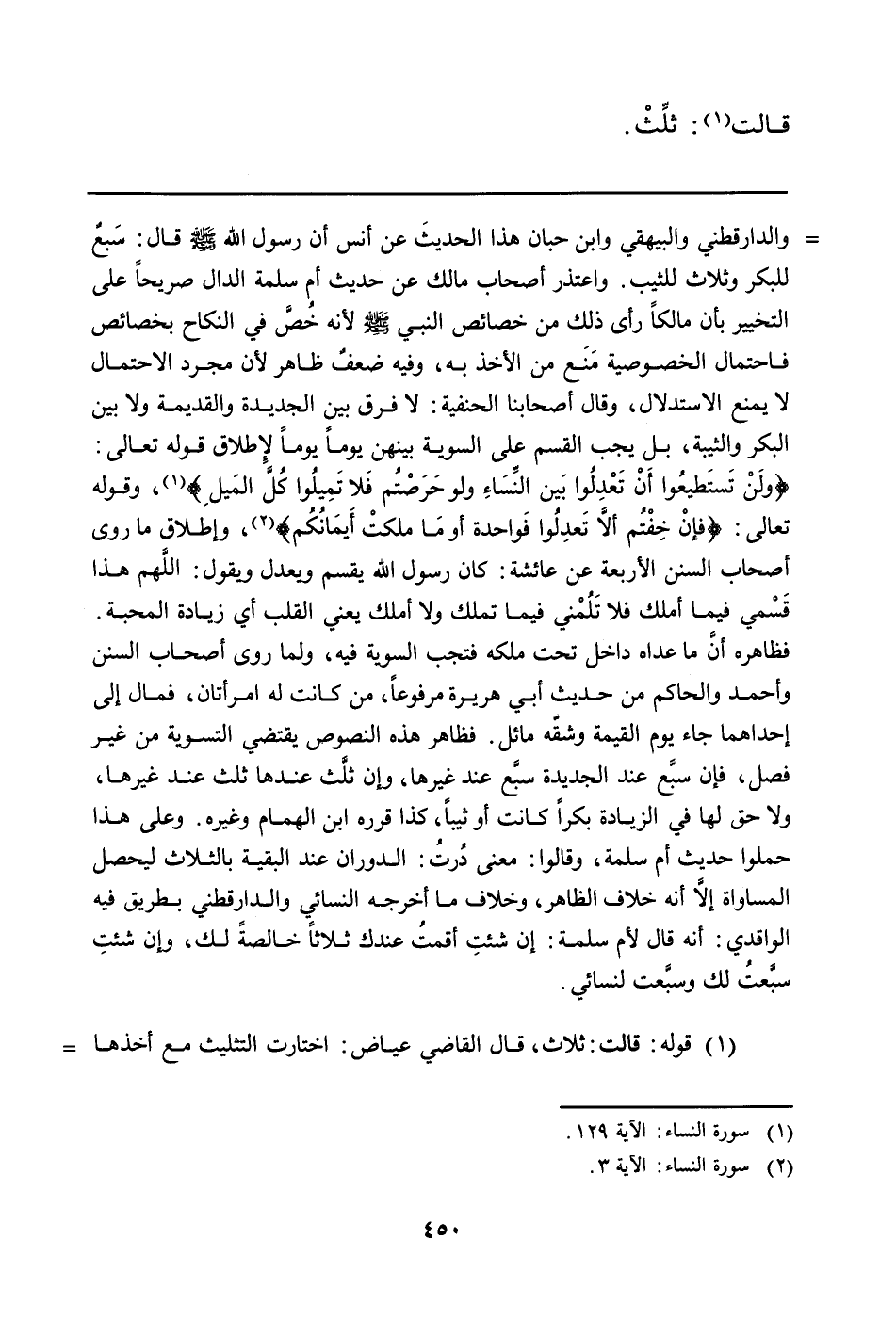 والدارقطني والبيهقي وابن حبان هذا الحديثَ عن أنس أن رسول الله صلى الله عليه وسلم قال: سَبعٌ للبكر وثلاث للثيب. واعتذر أصحاب مالك عن حديث أم سلمة الدال صريحاً على التخيير بأن مالكاً رأى ذلك من خصائص النبي صلى الله عليه وسلم لأنه خُصَّ في النكاح بخصائص فاحتمال الخصوصية مَنَع من الأخذ به، وفيه ضعفٌ ظاهر لأن مجرد الاحتمال لا يمنع الاستدلال، وقال أصحابنا الحنفية: لا فرق بين الجديدة والقديمة ولا بين البكر والثيبة، بل يجب القسم على السوية بينهن يوماً يوماً لإِطلاق قوله تعالى: {ولَنْ تَستَطيعُوا أَنْ تَعْدِلُوا بَين النِّسَاءِ ولو حَرَصْتُم فَلا تَمِيلُوا كُلَّ المَيلِ} (سورة النساء: الآية 129) ، وقوله تعالى: {فإنْ خِفْتُم ألا تَعدِلُوا فَواحدة أو مَا ملكتْ أَيمَانُكُم} (سورة النساء: الآية 3) ، وإطلاق ما روى أصحاب السنن الأربعة عن عائشة: كان رسول الله صلى الله عليه وسلم يقسم ويعدل ويقول: اللَّهم هذا قَسْمي فيما أملك فلا تَلُمْني فيما تملك ولا أملك يعني القلب أي زيادة المحبة. فظاهره أنَّ ماعداه داخل تحت ملكه فتجب السوية فيه، ولما روى أصحاب السنن وأحمد والحاكم من حديث أبي هريرة مرفوعاً، من كانت له امرأتان، فمال إلى إحداهما جاء يوم القيامة وشقّه مائل. فظاهر هذه النصوص يقتضي التسوية من غير فصل، فإن سبَّع عند الجديدة سبَّع عند غيرها، وإن ثلَّث عندها ثلث عند غيرها، ولا حق لها في الزيادة بكراً كانت أم ثيباً، كذا قرره ابن الهمام وغيره. وعلى هذا حملوا حديث أم سلمة، وقالوا: معنى دُرتُ: الدوران عند البقية بالثلاث ليحصل المساواة إلاَّ أنه خلاف الظاهر، وخلاف ما أخرجه النسائي والدارقطني بطريق فيه الواقدي: أنه قال لأم سلمة: إن شئتِ أقمتُ عندك ثلاثاً خالصةً لك، وإن شئتِ سبَّعتُ لك وسبَّعت لنسائي.