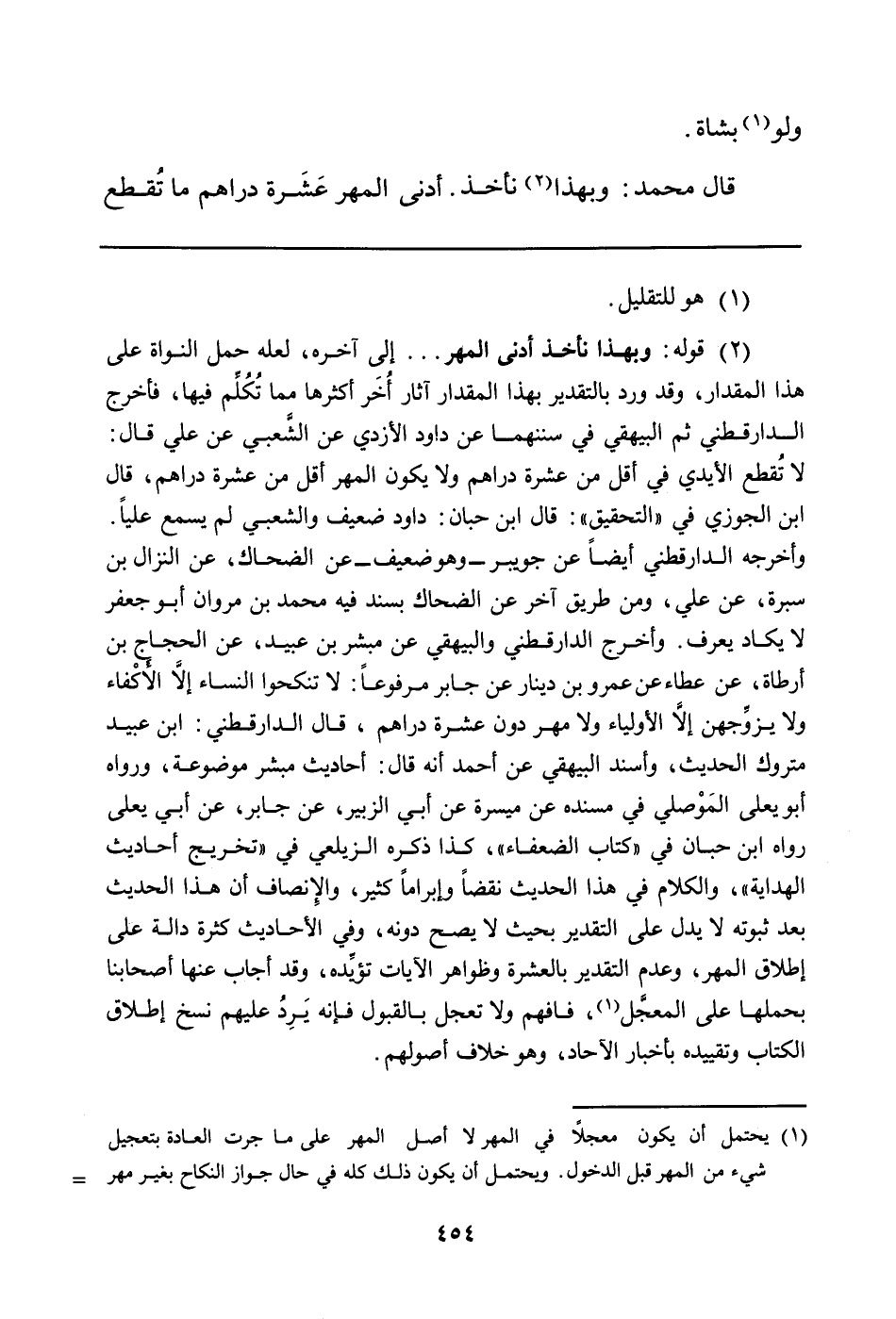 (¬2) قوله: وبهذا نأخذ أدنى المهر ... إلى آخره، لعله حمل النواة على هذا المقدار، وقد ورد بالتقدير بهذا المقدار آثار أُخَر أكثرها مما تُكُلِّم فيها، فأخرج الدارقطني ثم البيهقي في سننهما عن داود الأزدي عن الشَّعبي عن علي قال: لا تُقطع الأيدي في أقل من عشرة دراهم ولا يكون المهر أقل من عشرة دراهم، قال ابن الجوزي في "التحقيق": قال ابن حبان: داود ضعيف والشعبي لم يسمع علياً. وأخرجه الدارقطني أيضاً عن جويبر - وهو ضعيف - عن الضحاك، عن النزال بن سبرة، عن علي، ومن طريق آخر عن الضحاك بسند فيه محمد بن مروان أبو جعفر لا يكاد يعرف. وأخرج الدارقطني والبيهقي عن مبشر بن عبيد، عن الحجاج بن أرطأة، عن عطاء عن عمرو بن دينار عن جابر مرفوعاً: لا تنكحوا النساء إلاَّ الأَكْفاء ولا يزوِّجهن إلاَّ الأولياء ولا مهر دون عشرة دراهم، قال الدارقطني: ابن عبيد متروك الحديث، وأسند البيهقي عن أحمد أنه قال: أحاديث مبشر موضوعة، ورواه أبو يعلى المَوْصلي في مسنده عن ميسرة عن أبي الزبير، عن جابر، عن أبي يعلى رواه ابن حبان في "كتاب الضعفاء"، كذا ذكره الزيلعي في "تخريج أحاديث الهداية"، والكلام في هذا الحديث نقضاً وإبراماً كثير، والإِنصاف أن هذا الحديث بعد ثبوته لا يدل على التقدير بحيث لا يصح دونه، وفي الأحاديث كثرة دالة على إطلاق المهر، وعدم التقدير بالعشرة وظواهر الآيات تؤيِّده، وقد أجاب عنها أصحابنا بحملها على المعجَّل (يحتمل أن يكون معجلاً في المهر لا أصل المهر على ما جرت العادة بتعجيل شيء من المهر قبل الدخول. ويحتمل أن يكون ذلك كله في حال جواز النكاح بغير مهر على ما قيل: إن النكاح كان جائزاً بغير مهر إلى أن نهى النبي صلى الله عليه وسلم عن الشِّغار. بذل المجهود 10/131) ، فافهم ولا تعجل بالقبول فإنه يَرِدُ عليهم نسخ إطلاق الكتاب وتقييده بأخبار الآحاد، وهو خلاف أصولهم.