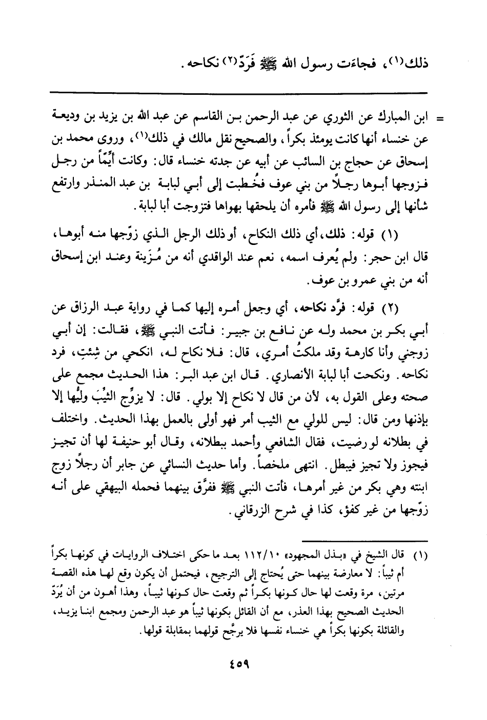ابن المبارك عن الثوري عن عبد الرحمن بن القاسم عن عبد الله بن يزيد بن وديعة عن خنساء أنها كانت يومئذ بكراً، والصحيح نقل مالك في ذلك (قال الشيخ في "بذل المجهود"10/112 بعد ما حكى اختلاف الروايات في كونها بكراً أم ثيباً: لا معارضة بينهما حتى يُحتاج إلى الترجيح، فيحتمل أن يكون وقع لها هذه القصة مرتين، مرة وقعت لها حال كونها بكراً ثم وقعت حال كونها ثيباً، وهذا أهون من أن يُرَدّ الحديث الصحيح بهذا العذر، مع أن القائل بكونها ثيباً هو عبد الرحمن ومجمع ابنا يزيد، والقائلة بكونها بكراً هي خنساء نفسها فلا يرجَّح قولهما بمقابلة قولها) ، وروى محمد بن إسحاق عن حجاج بن السائب عن أبيه عن جدته خنساء قال: وكانت أيِّمّاً من رجل فزوجها أبوها رجلاً من بني عوف فخُطبت إلى أبي لبابة بن عبد المنذر وارتفع شأنها إلى رسول الله صلى الله عليه وسلم فأمره أن يلحقها بهواها فتزوجت أبا لبابة.