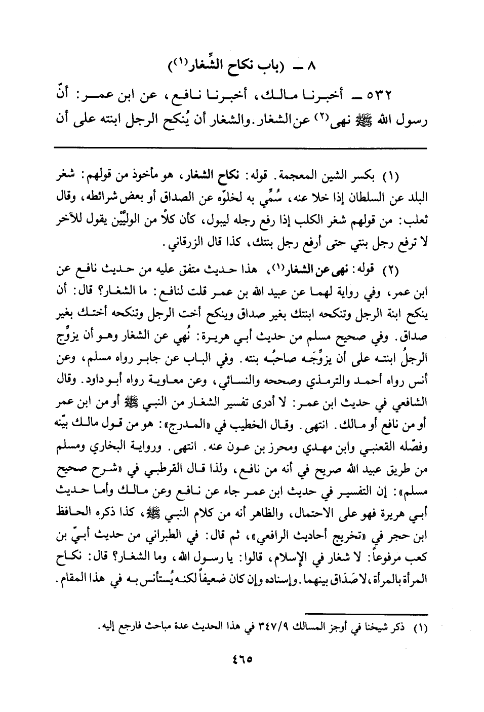 532 - أَخْبَرَنَا مَالِكٌ، أَخْبَرَنَا نَافِعٌ، عن ابن عمر: أن رسول الله صلى اللَّهُ عَلَيْهِ وَسَلَّمَ نَهَى (¬2) عَنِ الشِّغَارِ. وَالشِّغَارُ أن يُنكح الرجل ابنته على أن