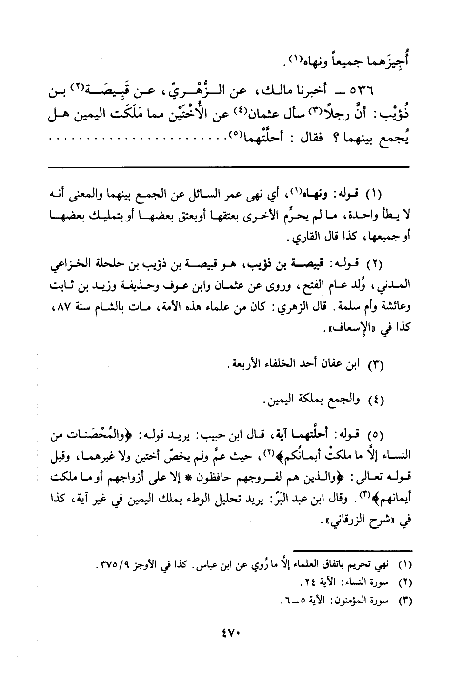 536 - أَخْبَرَنَا مَالِكٌ، عَنِ الزُّهْريّ، عَنْ قّبِيصّة (¬2) بْنِ ذُؤيْب: أنَّ رَجُلا (¬3) سَأَلَ عُثْمَانَ (¬4) عَنِ الأُخْتَيْن مِمَّا مَلَكَت الْيَمِينُ هَلْ يُجمع بينهما؟ فقال: أحلَّتْهما (¬5)