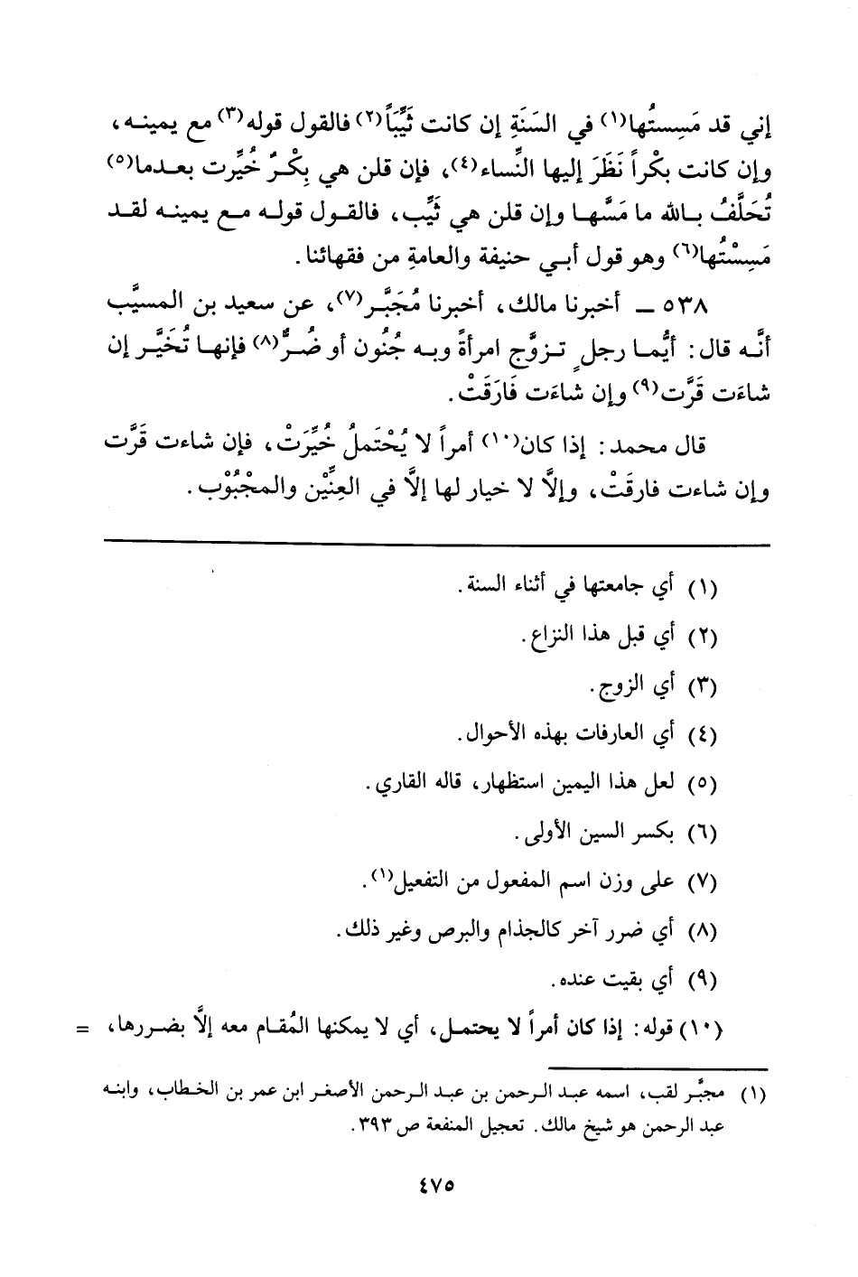 538 - أَخْبَرَنَا مَالِكٌ، أَخْبَرَنَا مُجَبَّر (¬7) ، عَنْ سَعِيدِ بْنِ المسيَّب أنَّه قَالَ: أيُّما رجلٍ تزوَّج امْرَأَةً وَبِهِ جُنُون أَوْ ضُرٌّ (¬8) فَإِنَّهَا تُخَيّر إِنْ شاءَت قَرَّت (¬9) وَإِنْ شاءَت فَارَقَتْ.