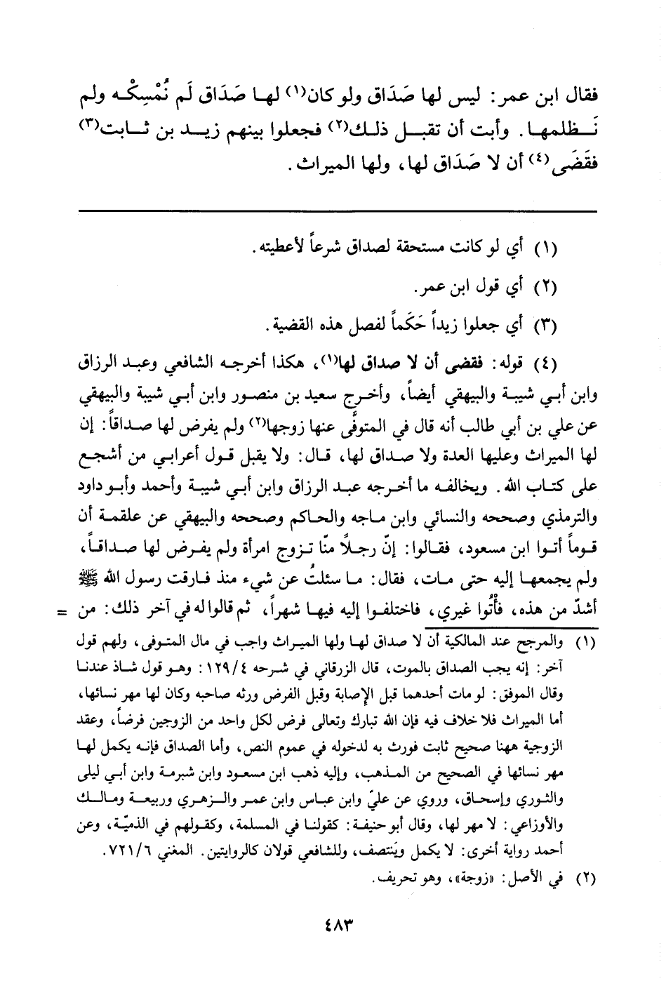 فَقَالَ ابْنُ عُمَرَ: لَيْسَ لَهَا صَدَاق وَلَوْ كَانَ (¬1) لَهَا صَدَاق لَم نُمْسِكْه وَلَمْ نَظلمها. وَأَبَتْ أَنْ تَقْبَلَ ذَلِكَ (¬2) فَجَعَلُوا بَيْنَهُمْ زَيْدَ بْنَ ثَابِتٍ (¬3) فقَضَى (¬4) أَنْ لا صَدَاق لَهَا، ولها الميراث.