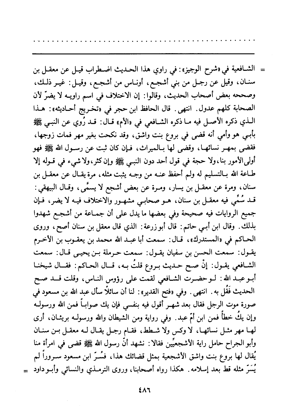 الشافعية في "شرح الوجيز": في راوي هذا الحديث اضطراب قيل عن معقل بن سنان، وقيل عن رجل من بني أشجع، أو ناس من أشجع، وقيل: غير ذلك، وصححه بعض أصحاب الحديث، وقالوا: إن الاختلاف في اسم راويه لا يضرّ لأن الصحابة كلهم عدول. انتهى. قال الحافظ ابن حجر في "تخريج أحاديثه": هذا الذي ذكره الأصل فيه ما ذكره الشافعي في "الأم" قال: قد رُوي عن النبي صلى الله عليه وسلم بأبي هو وأمي أنه قضى في بروع بنت واشق، وقد نكحت بغير مهر فمات زوجها، فقضى بمهر نسائها، وقضى لها بالميراث، فإن كان ثبت عن رسول الله صلى الله عليه وسلم فهو أولى الأمور بنا، ولا حجة في قول أحد دون النبي صلى الله عليه وسلم وإن كثر، ولا شيء في قوله إلا طاعة الله بالتسليم له ولم أحفظ عنه من وجه يثبت مثله، مرة يقال عن معقل بن سنان، ومرة عن معقل بن يسار، ومرة عن بعض أشجع لا يسمَّى، وقال البيهقي: قد سُمِّي فيه معقل بن سنان، هو صحابي مشهور والاختلاف فيه لا يضر، فإن جميع الروايات فيه صحيحة وفي بعضها ما يدل على أن جماعة من أشجع شهدوا بذلك. وقال ابن أبي حاتم: قال أبو زرعة: الذي قال معقل بن سنان أصح، وروى الحاكم في "المستدرك"، قال: سمعت أبا عبد الله محمد بن يعقوب بن الأخرم يقول: سمعت الحسن بن سفيان يقول: سمعت حرملة بن يحيى قال: سمعت الشافعي يقول: إنْ صح حديث بروع قلتُ به، قال الحاكم: فقال شيخنا أبو عبد الله: لو حضرت الشافعي لقمت على رؤوس الناس، وقلت قد صح الحديث فَقُل به. انتهى. وفي "فتح القدير": لنا أن سائلاً سأل عبد الله بن مسعود في صورة موت الرجل فقال بعد شهر أقول فيه بنفسي فإن يك صواباً فمن الله ورسوله وإن يكُ خطأً فمن ابن أمّ عبد. وفي رواية ومن الشيطان والله ورسوله بريئان، أرى لها مهر مثل نسائها، لاوكس ولا شطط، فقال رجل يقال له معقل بن سنان وأبو الجراح حامل راية الأشجعيِّين فقالا: نشهد أنّ رسول الله صلى الله عليه وسلم قضى في امرأة منا يُقال لها برووع بنت واشق الأشجعية بمثل قضائك هذا، فسُرّ ابن مسعود سروراً لم يُسَرّ مثله قط بعد إسلامه. هكذا رواه أصحابنا، وروى الترمذي والنسائي وأبو داود