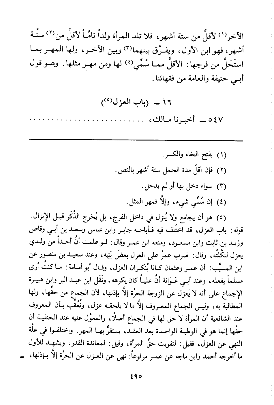 (¬5) هو أن يجامع ولا يُنزل في داخل الفرج، بل يُخرج الذَّكَر قبل الإِنزال. قوله: باب العزل، قد اختُلف فيه فأباحه جابر وابن عباس وسعد بن أبي وقاص وزيد بن ثابت وابن مسعود، ومنعه ابن عمر وقال: لو علمت أنَّ أحداً من ولدي يعزل لنكَّلتُه، وقال: ضرب عمرُ على العزل بعضَ بَنِيه، وعند سعيد بن منصور عن ابن المسيَّب: أن عمر وعثمان كانا يُنكران العزل، وقال أبو أمامة: ما كنتُ أرى مسلماً يفعله، وعند أبي عَوَانة أنَّ علياً كان يكرهه، ونَقَل ابن عبد البر وابن هبيرة الإِجماع على أنه لا يَعزل عن الزوجة الحرَّة إلاَّ بإذنها، لأن الجماع من حقِّها، ولها المطالبة به، وليس الجماع المعروف إلاَّ ما لا يلحقه عزل، وتُعُقِّب بأن المعروف عند الشافعية أن المرأة لا حق لها في الجماع أصلاً، والمعوَّل عليه عند الحنفية أن حقَّها إنما هو في الوطئة الواحدة بعد العقد، يستقرُّ بها المهر. واختلفوا في علَّة النهي عن العزل، فقيل: لتفويت حقِّ المرأة، وقيل لمعاندة القدر، ويشهد للأول ما أخرجه أحمد وابن ماجه عن عمر مرفوعاً: نهى عن العزل عن الحرَّة إلاَّ بإذنها،