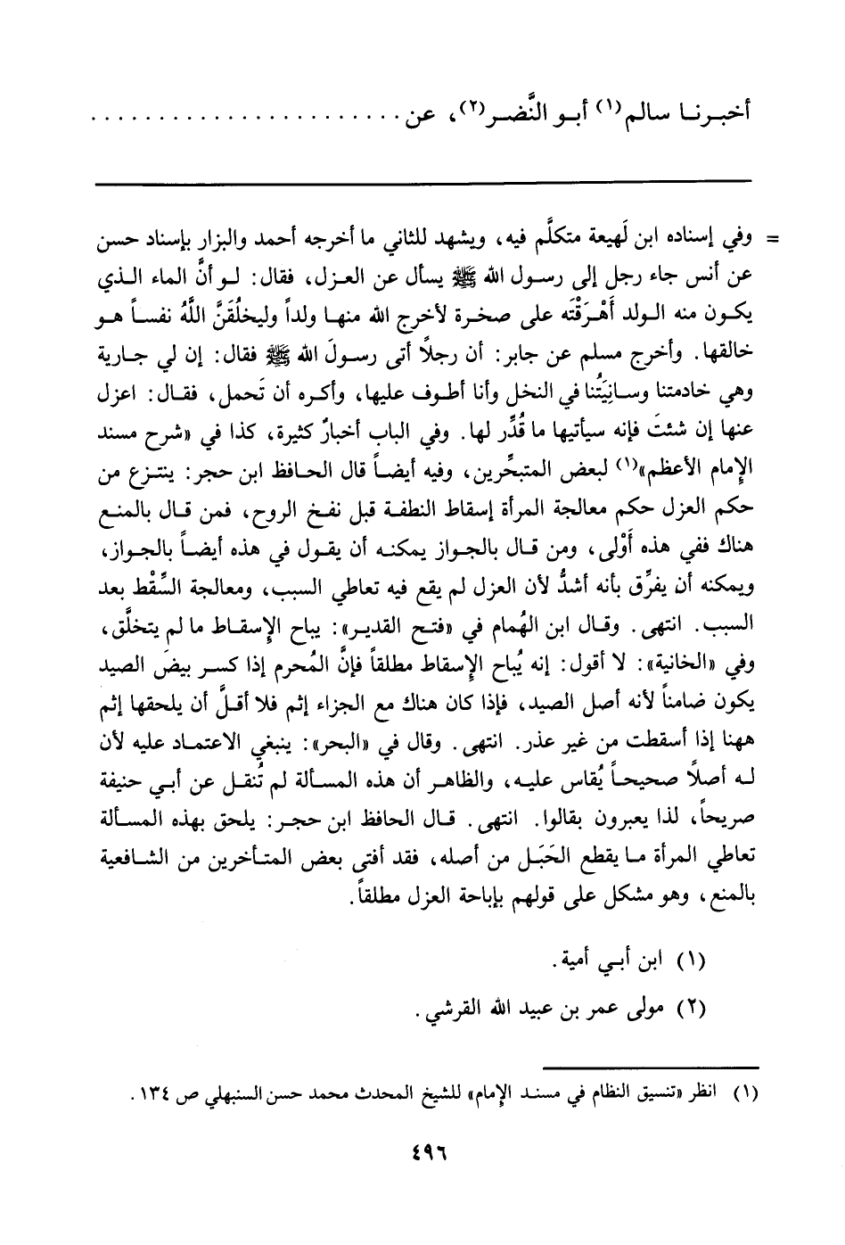 وفي إسناده ابن لَهيعة متكلَّم فيه، ويشهد للثاني ما أخرجه أحمد والبزار بإسناد حسن عن أنس جاء رجل إلى رسول الله صلى الله عليه وسلم يسأل عن العزل، فقال: لو أنَّ الماء الذي يكون منه الولد أَهْرَقْتَه على صخرة لأخرج الله منها ولداً وليخلُقَنَّ اللَّهُ نفساً هو خالقها. وأخرج مسلم عن جابر: أن رجلاً أتى رسولَ الله صلى الله عليه وسلم فقال: إن لي جارية وهي خادمتنا وسانِيَتُنا في النخل وأنا أطوف عليها، وأكره أن تَحمل، فقال: اعزل عنها إن شئتَ فإنه سيأتيها ما قُدِّر لها. وفي الباب أخبارٌ كثيرة، كذا في "شرح مسند الإمام الأعظم" (انظر "تنسيق النظام في مسند الإِمام" للشيخ المحدث محمد حسن السنبهلي ص 134) لبعض المتبحِّرين، وفيه أيضاً قال الحافظ ابن حجر: ينتزع من حكم العزل حكم معالجة المرأة إسقاط النطفة قبل نفخ الروح، فمن قال بالمنع هناك ففي هذه أَوْلى، ومن قال بالجواز يمكنه أن يقول في هذه أيضاً بالجواز، ويمكنه أن يفرِّق بأنه أشدُّ لأن العزل لم يقع فيه تعاطي السبب، ومعالجة السِّقْط بعد السبب. انتهى. وقال ابن الهُمام في "فتح القدير": يباح الإِسقاط ما لم يتخلَّق، وفي "الخانية": لا أقول: إنه يُباح الإِسقاط مطلقاً فإنَّ المُحرم إذا كسر بيضَ الصيد يكون ضامنا لأنه أصل الصيد، فإذا كان هناك مع الجزاء إثم فلا أقلَّ أن يلحقها إثم ههنا إذا أسقطت من غير عذر. انتهى. وقال في "البحر": ينبغي الاعتماد عليه لأن له أصلاً صحيحاً يُقاس عليه، والظاهر أن هذه المسألة لم تُنقل عن أبي حنيفة صريحاً، لذا يعبرون بقالوا. انتهى. قال الحافظ ابن حجر: يلحق بهذه المسألة تعاطي المرأة ما يقطع الحَبَل من أصله، فقد أفتى بعض المتأخرين من الشافعية بالمنع، وهو مشكل على قولهم بإباحة العزل مطلقاً.