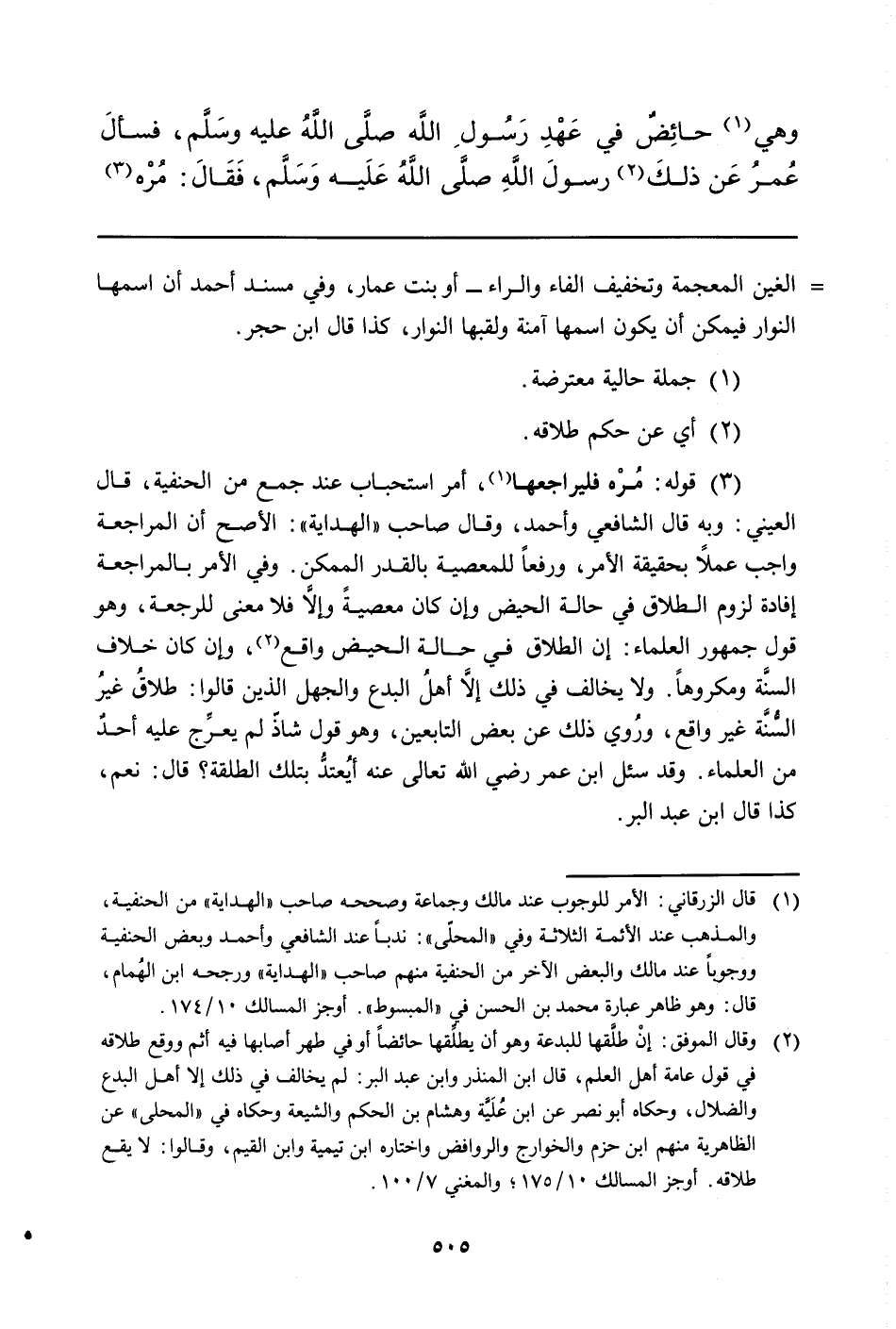 (¬3) قوله: مُرْه فليراجعها (قال الزرقاني: الأمر للوجوب عند مالك وجماعة وصححه صاحب "الهداية": من الحنفية، والمذهب عند الأئمة الثلاثة وفي "المحلى": ندباً عند الشافعي وأحمد وبعض الحنفية ووجوباً عند مالك والبعض الآخر من الحنفية منهم صاحب "الهداية" ورجحه ابن الهُمام، قال: وهو ظاهر عبارة محمد بن الحسن في "المبسوط". أوجز المسالك 10/174) ، أمر استحباب عند جمع من الحنفية، قال العيني: وبه قال الشافعي وأحمد، وقال صاحب "الهداية": الأصح أن المراجعة واجب عملاً بحقيقة الأمر، ورفعاً للمعصية بالقدر الممكن. وفي الأمر بالمراجعة إفادة لزوم الطلاق في حالة الحيض وإن كان معصيةً وإلاَّ فلا معنى للرجعة، وهو قول جمهور العلماء: إن الطلاق في حالة الحيض واقع (وقال الموفق: إن طلَّقها للبدعة وهو أن يطلِّقها حائضاً أو في طهر أصابها فيه أثم ووقع طلاقه في قول عامة أهل العلم، قال ابن المنذر وابن عبد البر: لم يخالف في ذلك إلا أهل البدع والضلال، وحكاه أبو نصر عن ابن عُلَيَّة وهشام بن الحكم والشيعة وحكاه في " المحلى" عن الظاهرية منهم ابن حزم والخوارج والروافض واختاره ابن تيمية وابن القيم، وقالوا: لا يقع طلاقه. أوجز المسالك 10/175 المغني 7/100) ، وإن كان خلاف السنَّة ومكروهاً. ولا يخالف في ذلك إلاَّ أهلُ البدع والجهل الذين قالوا: طلاقُ غيرُ السُّنَّة غير واقع، ورُوي ذلك عن بعض التابعين، وهو قول شاذّ لم يعرِّج عليه أحدٌ من العلماء. وقد سئل ابن عمر رضي الله تعالى عنه أيُعتدُّ بتلك الطلقة؟ قال: نعم، كذا قال ابن عبد البر.