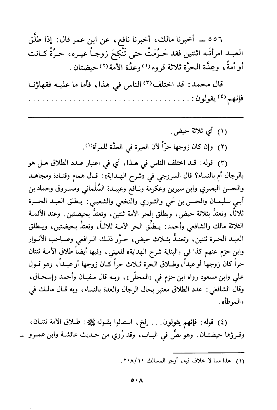 556 - أَخْبَرَنَا مَالِكٌ، أَخْبَرَنَا نَافِعٌ، عَنِ ابْنِ عُمَرَ قَالَ: إِذَا طلَّق الْعَبْدُ امرأتَه اثْنَتَيْنِ فَقَدْ حَرُمَتْ حَتَّى تَنْكِحَ زَوْجًا غَيْرَهُ، حرَّةً كَانَتْ أَوْ أَمَةً، وعِدَّة الحرَّة ثَلاثَةُ قُرُوءٍ (¬6) وعدَّة الأَمَةِ (¬7) حَيْضَتَانِ.