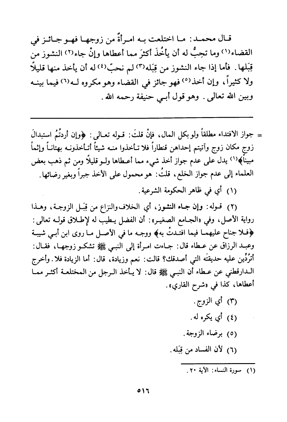 (¬2) قوله: وإن جاء النشوز، أي الخلاف والنزاع من قِبل الزوجة، وهذا رواية الأصل، وفي "الجامع الصغير": أن الفضل يطيب له لإطلاق قوله تعالى: (فلا جناح عليهما فيما افتدت به) ووجه ما في الأصل ما روى ابن أبي شيبة وعبد الرزاق عن عطاء قال: جاءت امرأة إلى النبي صلى الله عليه وسلّم تشكو زوجها، فقال: أتردين عليه حديقته التي أصدقك؟ قالت: نعم وزيادة، قال: أما الزيادة فلا. وأخرج الدارقطني عن عطاء أن النبي صلى الله عليه وسلّم قال: لا يأخذ الرجل من المختلعة أكثر مما أعطاها، كذا في "شرح القاري".