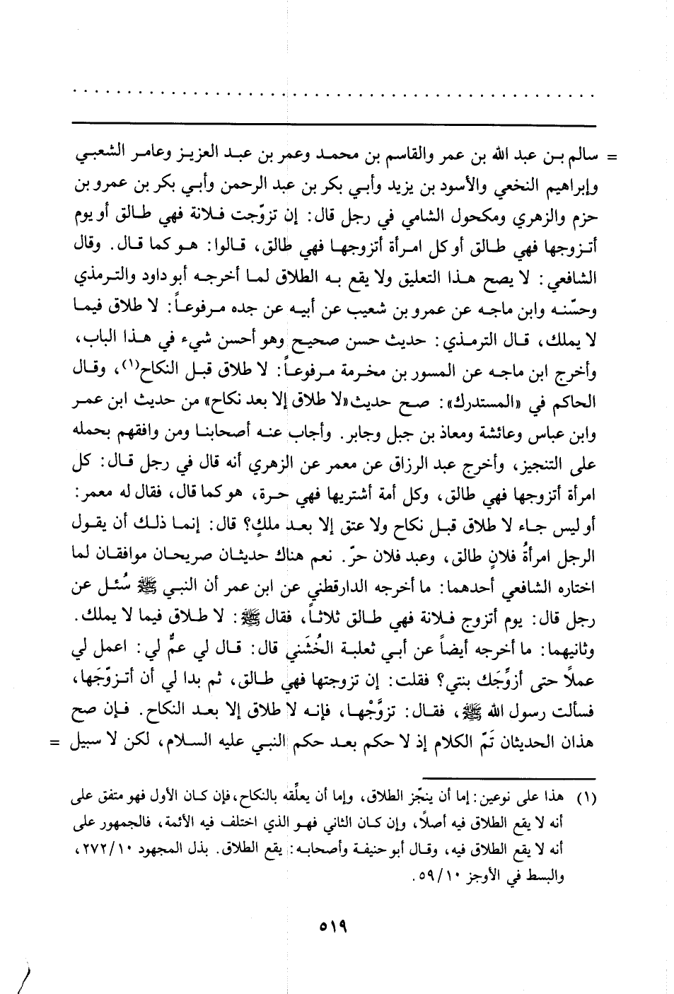 سالم بن عبد الله بن عمر والقاسم بن محمد وعمر بن عبد العزيز وعامر الشعبي وإبراهيم النخعي والأسود بن يزيد وأبي بكر بن عبد الرحمن وأبي بكر بن عمرو بن حزم والزهري ومكحول الشامي في رجل قال: إن تزوجت فلانة فهي طالق أو يوم أتزوجها فهي طالق أو كل امرأة أتزوجها فهي طالق، قالوا: هو كما قال. وقال الشافعي: لا يصح هذا التعليق ولا يقع به الطلاق لما أخرجه أبو داود والترمذي وحسنه وابن ماجه عن عمرو بن شعيب عن أبيه عن جده معروفاً: لا طلاق فيما لا يملك، قال الترمذي: حديث حسن صحيح وهو أحسن شيء في هذا الباب، وأخرجه ابن ماجه عن المسور بن مخرمة مرفوعاً: لا طلاق قبل النكاح (هذا على نوعين: إما أن ينجز الطلاق، وإما أن يعلقه بالنكاح، فإن كان الأول فهو متفق على أنه لا يقع الطلاق فيه أصلاً، وإذا كان الثاني فهو الذي اختلف فيه الأئمة، فالجمهور على أنه لا يقع الطلاق فيه، وقال أبو حنيفة وأصحابه: يقع الطلاق. بذل المجهود 10/272، والبسط في الأوجز 10/59) ، وقال الحاكم في "المستدرك": صح حديث "لا طلاق إلا بعد نكاح" من حديث ابن عمر وابن عباس وعائشة ومعاذ بن جبل وجابر. وأجاب عنه أصحابنا ومن وافقهم بحمله على التنجيز، وأخرج عبد الرزاق عن معمر عن الزهري أنه قال في رجل قال: كل امرأة أتزوجها فهي طالق، وكل أمة أشتريها فهي حرة، هو كما قال، فقال له معمر: أوليس جاء لا طلاق قبل نكاح ولاعتق إلا بعد ملكٍ؟ قال: إنما ذلك أن يقول الرجل امرأةُ فلانٍ طالق، وعبد فلان حر، نعم هناك حديثان صريحان موافقان لما اختاره الشافعي أحدهما: ما أخرجه الدارقطني عن ابن عمر أن النبي سُئل عن رجل قال: يوم أتزوج فلانة فهي طالق ثلاثاً، فقال صلى الله عليه وسلّم: لا طلاق فيما لا يملك. وثانيهما: ما أخرجه أيضاً عن أبي ثعلبة الخُشني قال: قال لي عمٌ لي: اعمل لي عملاً حتى أزوجك بنتي؟ فقلت: إن تزوجتها فهي طالق، ثم بدا لي أن أتزوجَها، فسألت رسول الله صلى الله عليه وسلّم، فقال: تزوجها، فإنه لا طلاق إلا بعد نكاح. فإن صح هذان الحديثان تَمَّ الكلام إذ لاحكم بعد حكم النبي عليه السلام، لكن لا سبيل