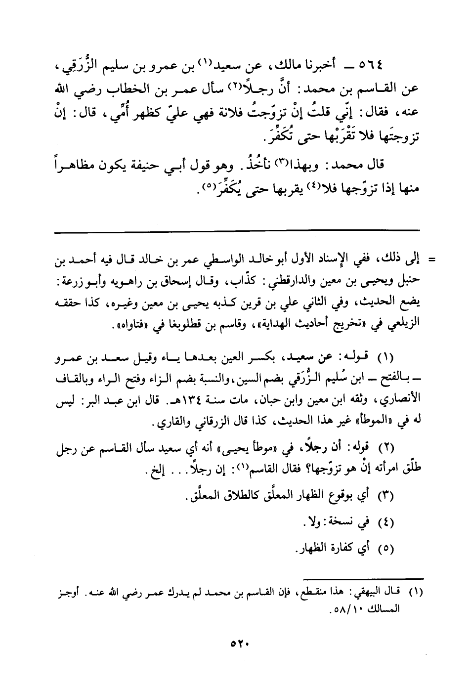 564 - أَخْبَرَنَا مَالِكٌ، عَنْ سَعِيدِ (¬1) بْنِ عَمْرِو بْنِ سُلَيْمٍ الزُّرَقِيِّ، عَنِ الْقَاسِمِ بْنِ مُحَمَّدٍ: أَنَّ رَجُلا (¬2) سَأَلَ عُمَرَ بْنَ الْخَطَّابِ رَضِيَ الله عنه، فقال: إن قُلت إِنْ تَزَوَّجْتُ فُلانَةً فَهِيَ عليَّ كَظَهْرِ أُمِّي، قَالَ: إِنْ تَزَوَّجْتَهَا فَلا تَقْرَبْهَا حَتَّى تُكفرَ.