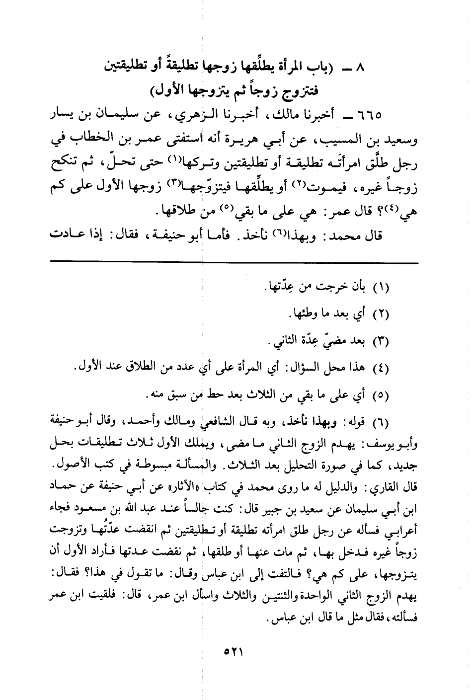 665 - أَخْبَرَنَا مَالِكٌ، أَخْبَرَنَا الزُّهْرِيُّ، عَنْ سُلَيْمَانَ بْنِ يَسَارٍ وَسَعِيدِ بْنِ الْمُسَيِّبِ، عَنْ أَبِي هُرَيْرَةَ أَنَّهُ اسْتَفْتَى عُمَرَ بْنَ الْخَطَّابِ فِي رَجُلٍ طَلَّقَ امْرَأَتَهُ تَطْلِيقَةً أَوْ تَطْلِيقَتَيْنِ وَتَرَكَهَا (¬1) حَتَّى تَحِلَّ، ثُمَّ تَنْكِحَ زَوْجًا غَيْرَهُ، فَيَمُوتَ (¬2) أَوْ يُطَلَّقَا فَيَتَزَوَّجُهَا (¬3) زَوْجُهَا الأَوَّلُ عَلَى كَمْ هِيَ (¬4) ؟ قَالَ عُمَرُ: هِيَ عَلَى مَا بَقِيَ (¬5) مِنْ طَلاقِهَا.
