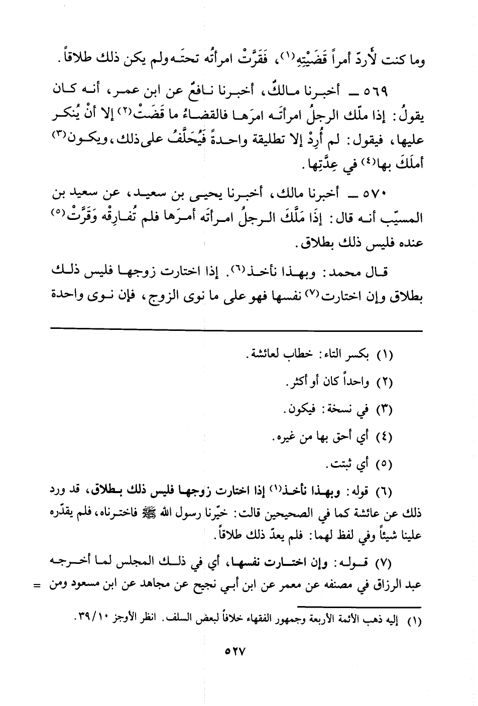 569 - أَخْبَرَنَا مالكٌ، أَخْبَرَنَا نافعٌ عَنِ ابْنِ عُمَرَ، أَنَّهُ كَانَ يقولُ: إِذَا مَلَّكَ الرجلُ امرأَته أمرهَا فالقضاءُ مَا قَضَتْ (¬2) إِلا أنْ يُنكر عَلَيْهَا، فَيَقُولُ: لَمْ أُرِدْ إِلا تَطْلِيقَةً واحدةْ فَيُحَلَّفُ عَلَى ذَلِكَ، وَيَكُونُ (¬3) أملَكَ بِهَا (¬4) فِي عِدَّتِها.