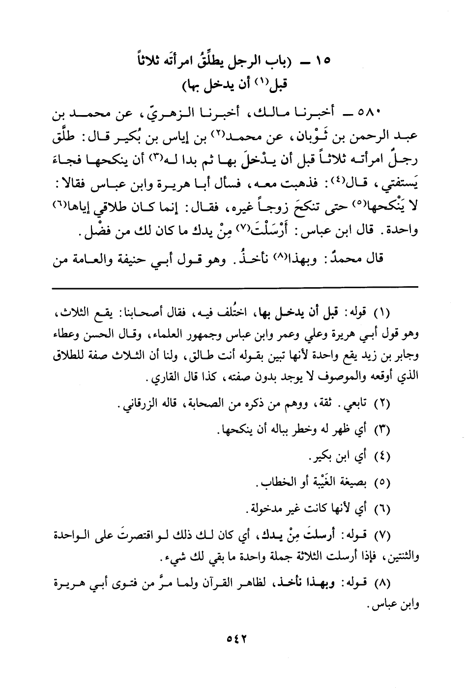 580 - أَخْبَرَنَا مَالِكٌ، أَخْبَرَنَا الزُّهْرِيُّ، عَنْ مُحَمَّدِ بْنِ عَبْدِ الرَّحْمَنِ بْنِ ثَوبان، عَنْ مُحَمَّدِ (¬2) بْنِ إِيَاسِ بْنِ بُكير قَالَ: طلَّق رجلٌ امْرَأَتَهُ ثَلاثًا قَبْلَ أَنْ يدْخل بِهَا ثُمَّ بَدَا لَهُ (¬3) أَنْ يَنْكِحَهَا فجاءَ يَستفتي، قَالَ (¬4) : فَذَهَبَتْ مَعَهُ، فَسَأَلَ أَبَا هُرَيْرَةَ وَابْنُ عَبَّاسٍ فَقَالا: لا يَنْكحها (¬5) حَتَّى تنكحَ زَوْجًا غَيْرَهُ، فَقَالَ: إِنَّمَا كَانَ طَلاقِي إِيَّاهَا (¬6) وَاحِدَةً. قَالَ ابْنُ عَبَّاسٍ: أَرْسَلْتَ (¬7) مِنْ يَدِكَ مَا كَانَ لَكَ مِنْ فضْل.