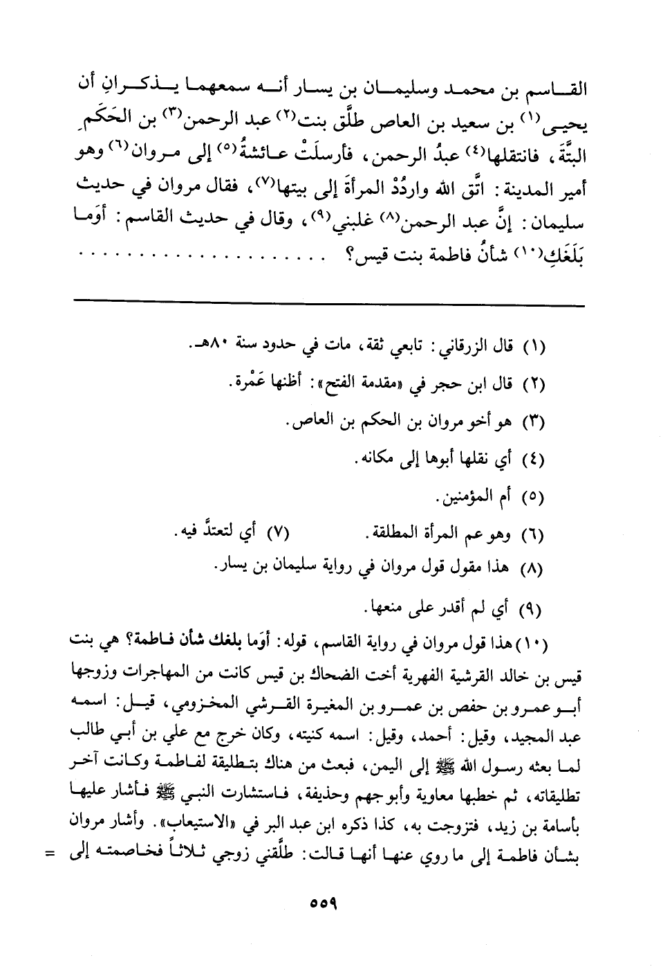 الْقَاسِمِ بْنِ مُحَمَّدٍ وَسُلَيْمَانَ بْنِ يَسَارٍ أَنَّهُ سَمِعَهُمَا يذكرانِ أَنَّ يَحْيَى (¬1) بْنَ سَعِيدِ بْنِ الْعَاصِ طلَّق بِنْتَ (¬2) عَبْدِ الرَّحْمَنِ (¬3) بْنِ الحَكَمِ البتَّةَ، فَانْتَقَلَهَا (¬4) عبدُ الرَّحْمَنِ، فأرسلَتْ عائشةُ (¬5) إِلَى مَرْوَانَ (¬6) وَهُوَ أَمِيرُ الْمَدِينَةِ: اتَّق اللَّهَ واردُدْ المرأةَ إِلَى بَيْتِهَا (¬7) ، فَقَالَ مَرْوَانُ فِي حَدِيثِ سُلَيْمَانَ: إنَّ عَبْدَ الرَّحْمَنِ (¬8) غَلَبَنِي (¬9) ، وَقَالَ فِي حَدِيثِ الْقَاسِمِ: أوَما بَلَغَكِ (¬10) شأنُ فَاطِمَةَ بِنْتِ قيس؟